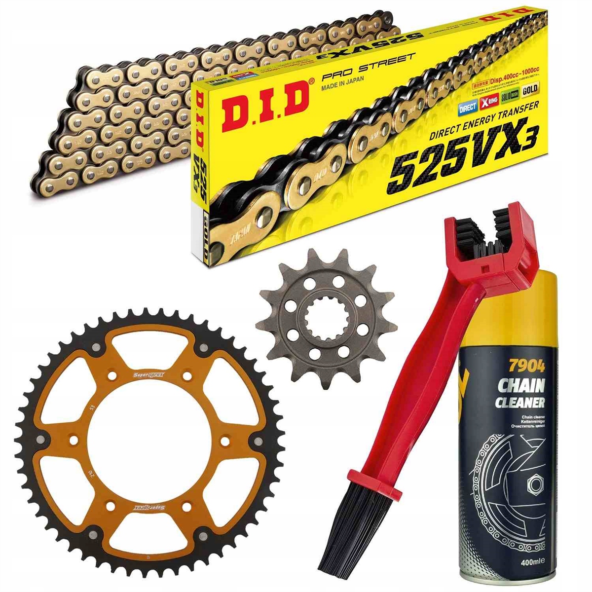 ланцюг: DID 525VX3 G&B PROFESSIONAL (посилене Х-кільце, [золоті зовнішні ланки]) 110 ланок + наконечник