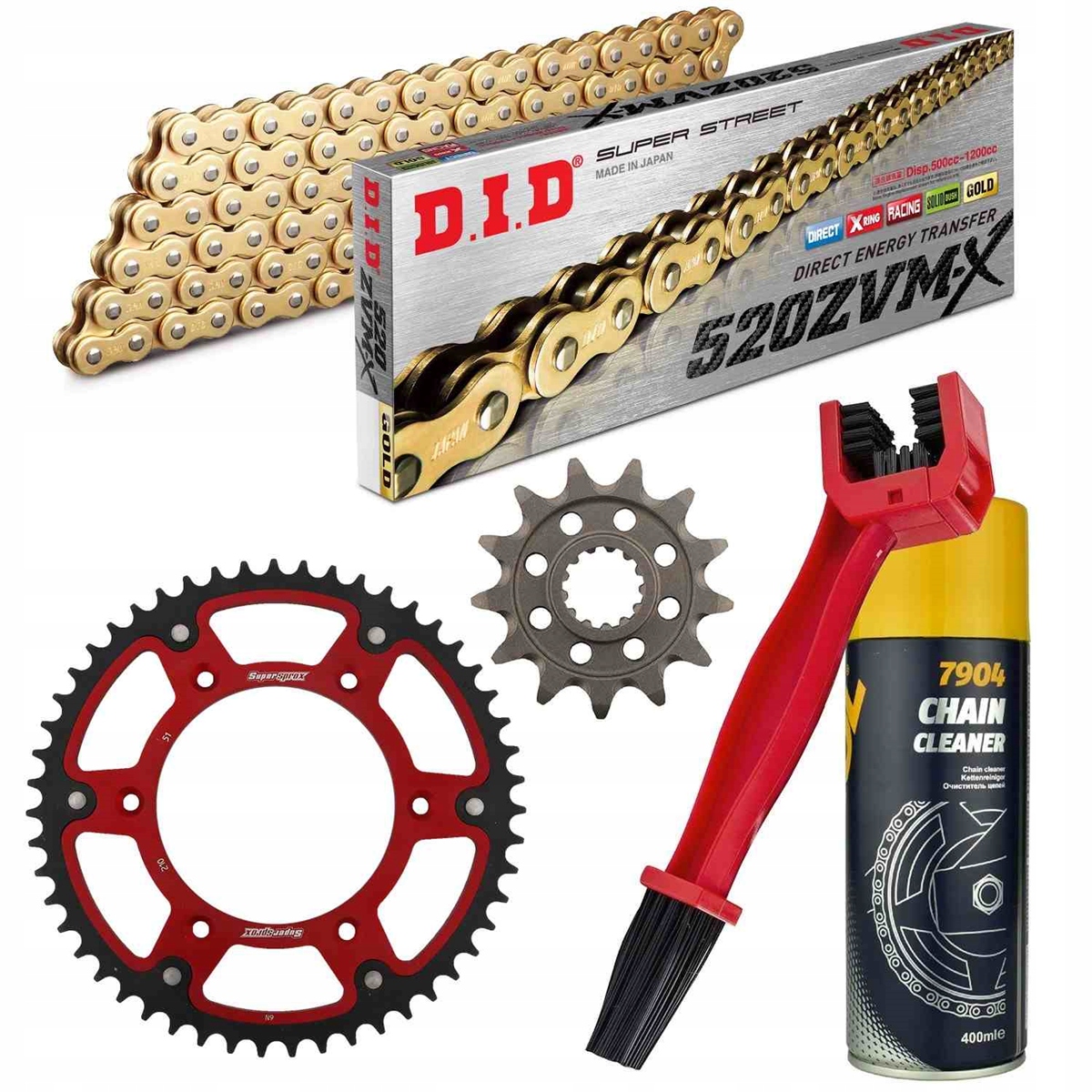 ланцюг: DID 520ZVM-X G&G (гіперпосилене Х-кільце, [золоті зовнішні + внутрішні ланки]) 116 ланок + наконечник