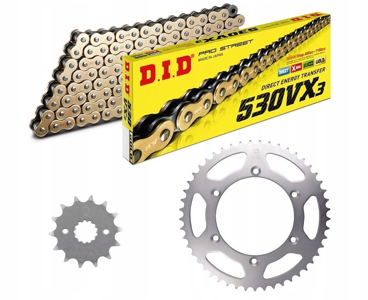 ланцюг: DID 530VX3 G&B PROFESSIONAL (X-ring суперпосилене, [золоті зовнішні ланки]) 110 ланок + наконечник
