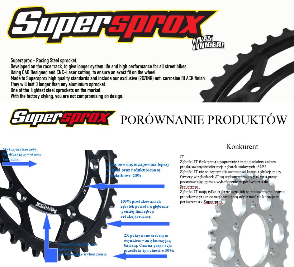 Розроблено на гоночному треку для забезпечення довговічності та високої продуктивності. Розроблено в CAD і CNC-лазері для забезпечення ідеальної установки на колесі. Виготовлений зі сталі SC-45 за високими стандартами Supersprox, покритий унікальним антикорозійним подвійним оцинкованим покриттям (покриття під назвою 2XZINK) і оздоблений чорним кольором. Вони прослужать в 3 рази довше, ніж будь-яка алюмінієва зірочка. Одна з найлегших сталевих зірочок на ринку. Увага до деталей також стосується зовнішнього вигляду.