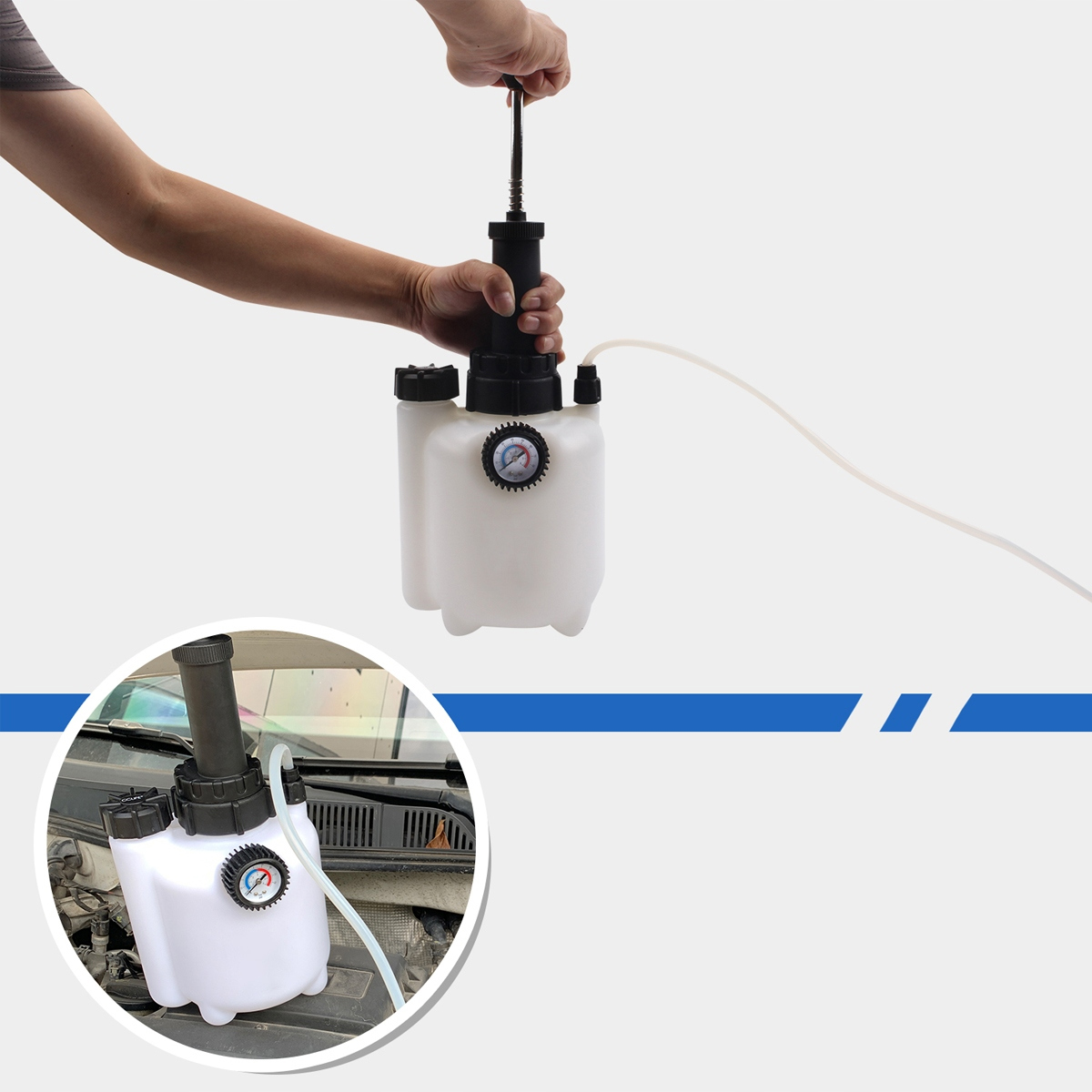 Якщо в гальмівній системі є повітря, гальмівна рідина стане вологою та зіпсується. Заміна гальмівного циліндра буде складною і може призвести до відмови гальм. Тому гальмівну рідину слід регулярно перевіряти та замінювати, щоб забезпечити належне функціонування. Цей 3-літровий набір для прокачки гальмівної рідини підходить для роботи однією людиною без сторонньої допомоги для ефективного, швидкого та надійного видалення повітря та використаної гальмівної рідини з гальмівних ліній. Підходить для більшості популярних європейських автомобілів.