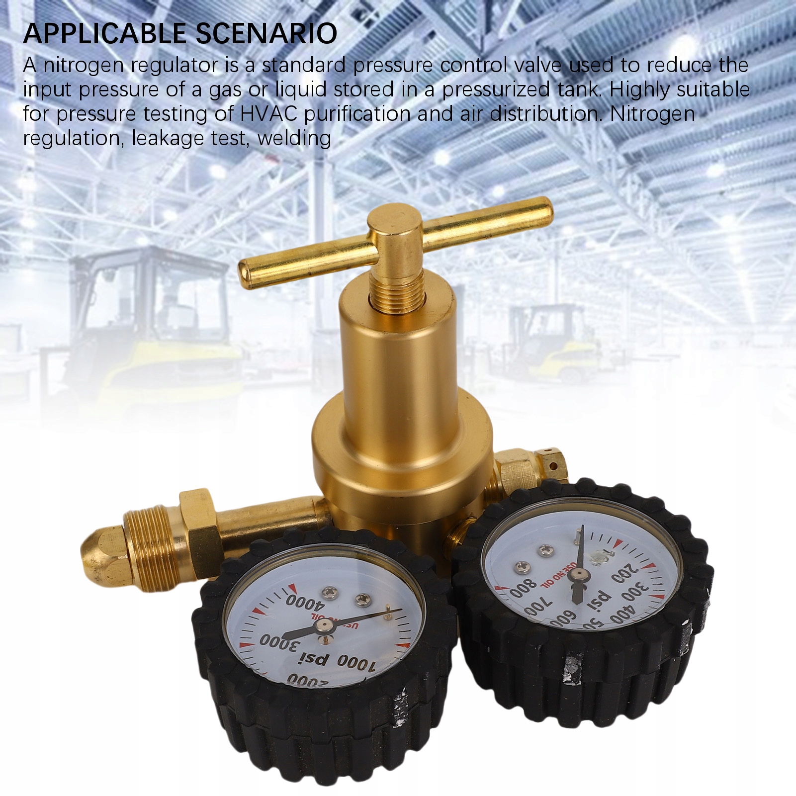 2. Застосовний сценарій: регулятор азоту — це стандартний клапан регулювання тиску, який використовується для зниження вхідного тиску газу або рідини, що зберігається в посудині під тиском. Дуже добре підходить для тестування тиску продувки систем опалення, вентиляції та кондиціонування повітря та розподілу повітря. Регулювання азоту, тест на витік, SNAPADING
