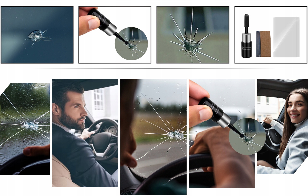 Набір для ремонту сколів на автомобільному склі, містить глибоко проникаючу смолу, яка ефективно заповнює щілини. Скол може виникнути влітку чи взимку, коли машина, що їде попереду, кидає камінчики у наше лобове скло.