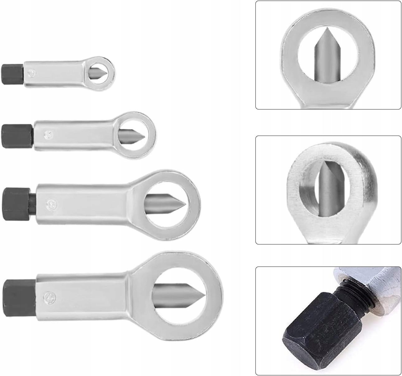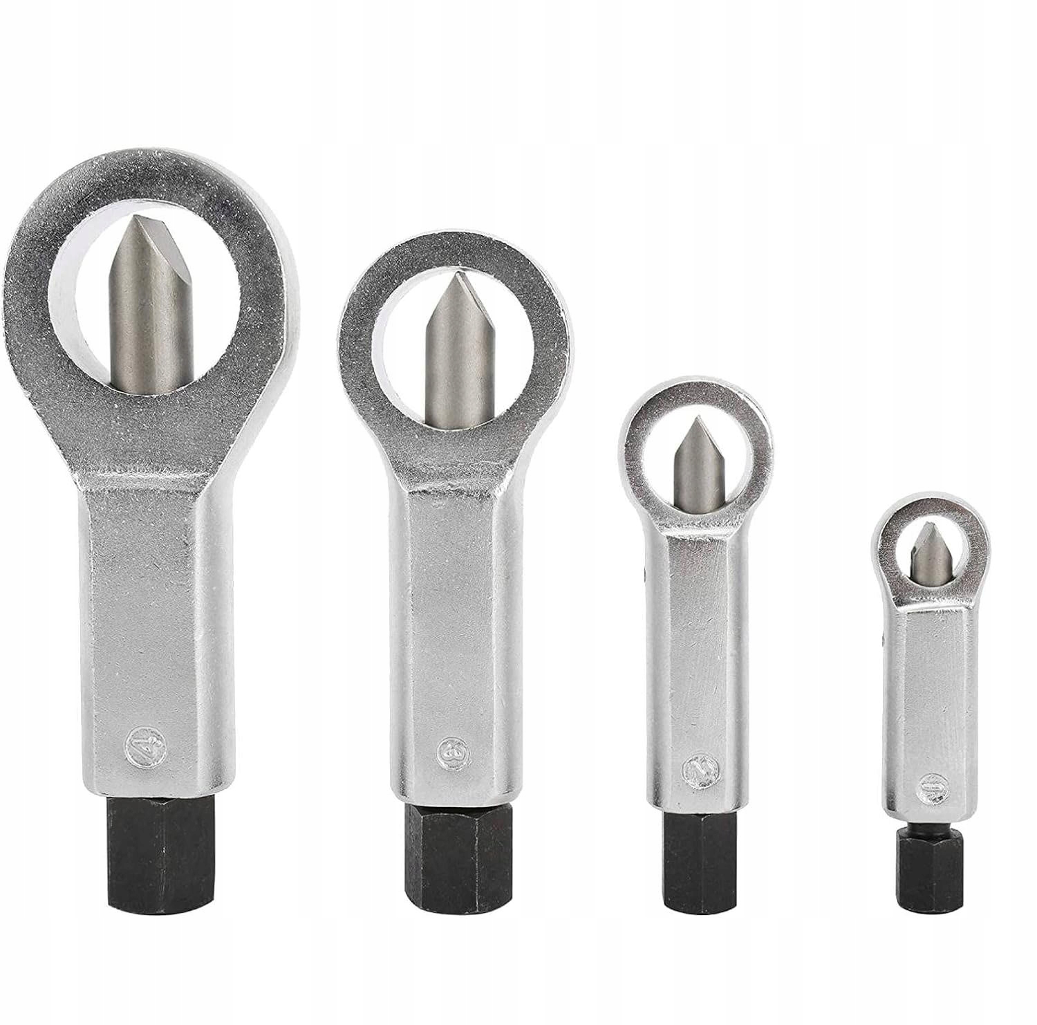 Професійний набір з чотирьох фрез з ріжучими хвостовиками з високоякісної сталі для заїдаючих або приварених гайок або болтів.