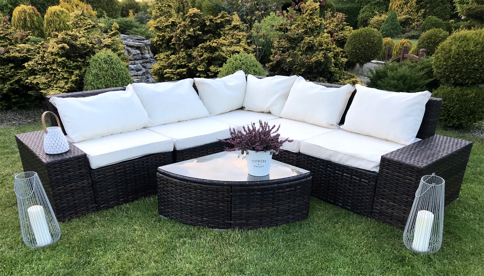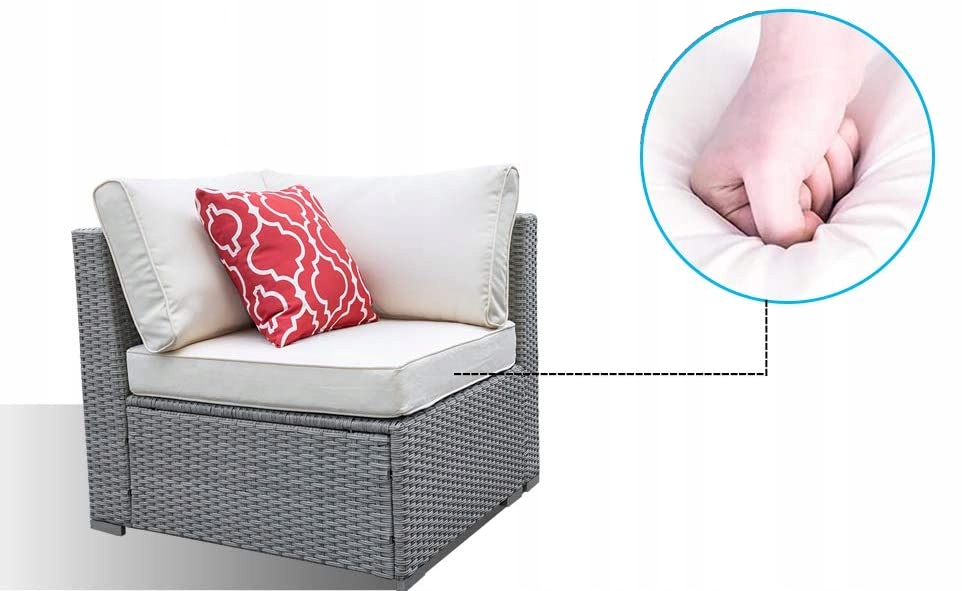 Це ідеально виглядає як на терасі, так і на газоні. Можна використовувати як гарнітур або кутовий диван. Стіл зі стільницею із загартованого скла. Техноротанг стійкий до погодних умов і ультрафіолету. Наволочки з просоченого матеріалу, знімаються на блискавці - можна прати. У комплекті 5 подушок для сидіння та 6 подушок для спинки.