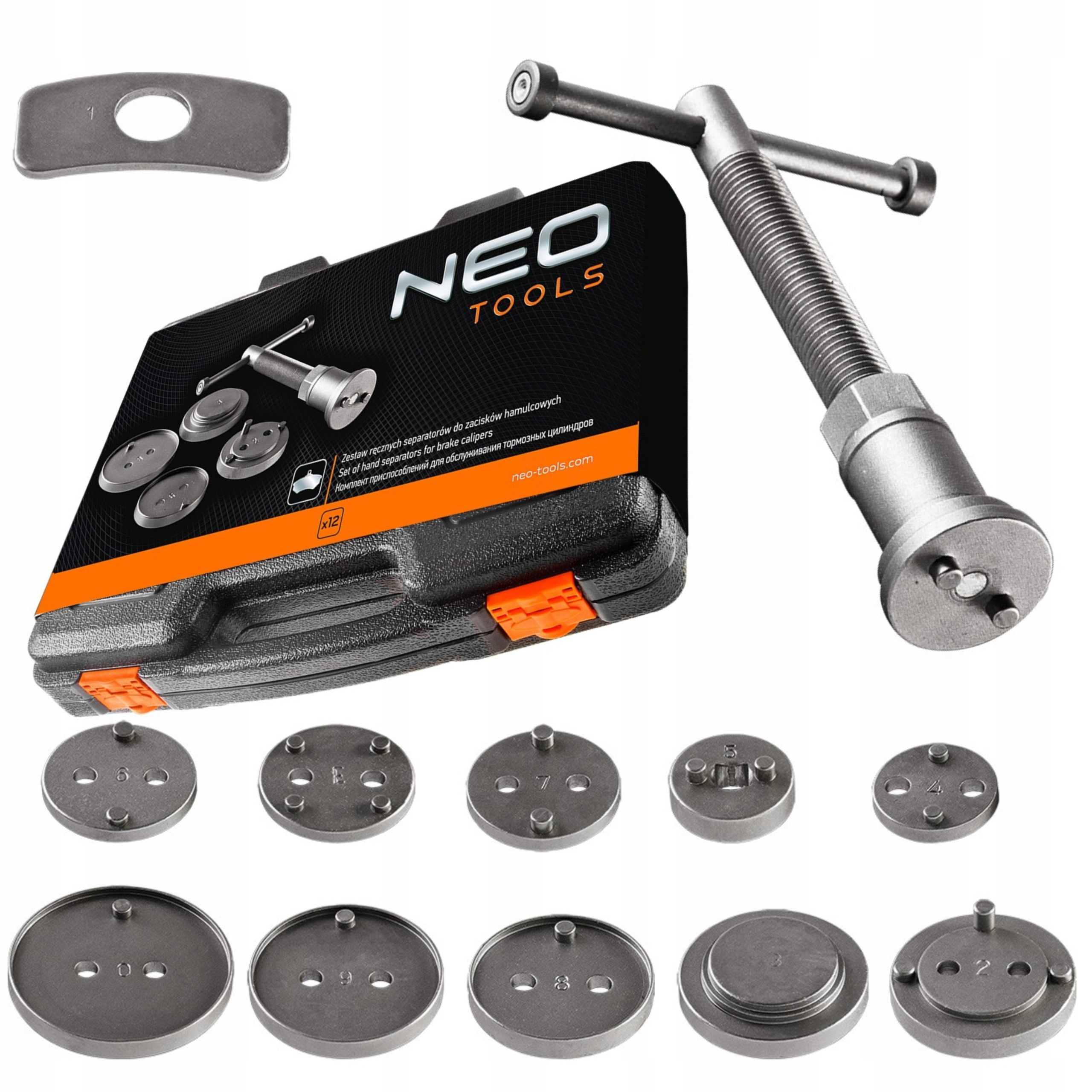 Набір сепараторів гальмівних супортів NEO (арт. № 11-123) складається з 12 елементів, включаючи ручний прес і набір пластин. Дозволяє проводити обслуговування і заміну поршнів в гальмівних супортах популярних марок автомобілів. Це необхідне обладнання для кожного професійного автосервісу. Все це зроблено з високоякісної сталі і поставляється в практичній пластиковій коробці. Бренд NEO відповідає очікуванням професіоналів.