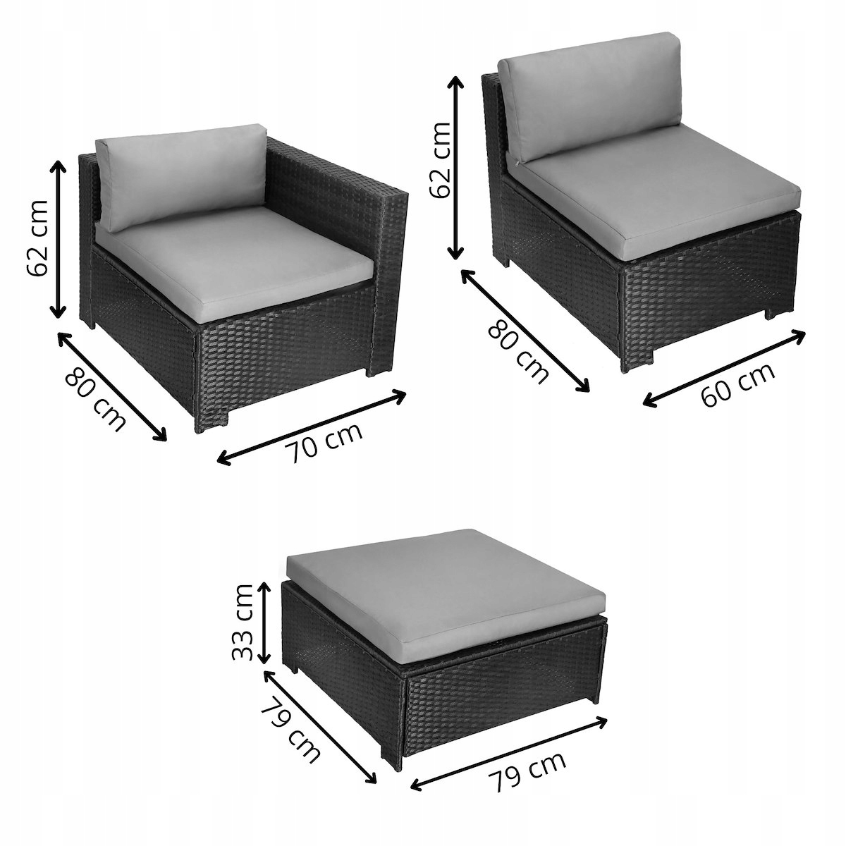 - Елементи в комплекті: 1x крісло, 2x кутовий модуль (ліворуч і справа), 1x прямий модуль зі спинкою, 1x квадратний модуль, 1x журнальний столик