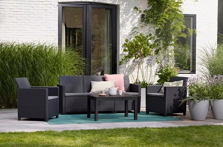 Змініть своє патіо, балкон чи подвір'я за допомогою набору Claire, виготовленого з формованого пластику, що імітує натуральний ротанг. Комплект складається з 2 крісел, тримісного дивана та столу. Включає подушки, які забезпечать додатковий комфорт під час відпочинку. Набір дуже простий у догляді. Продукт має високу стійкість до УФ-променів і атмосферних факторів.