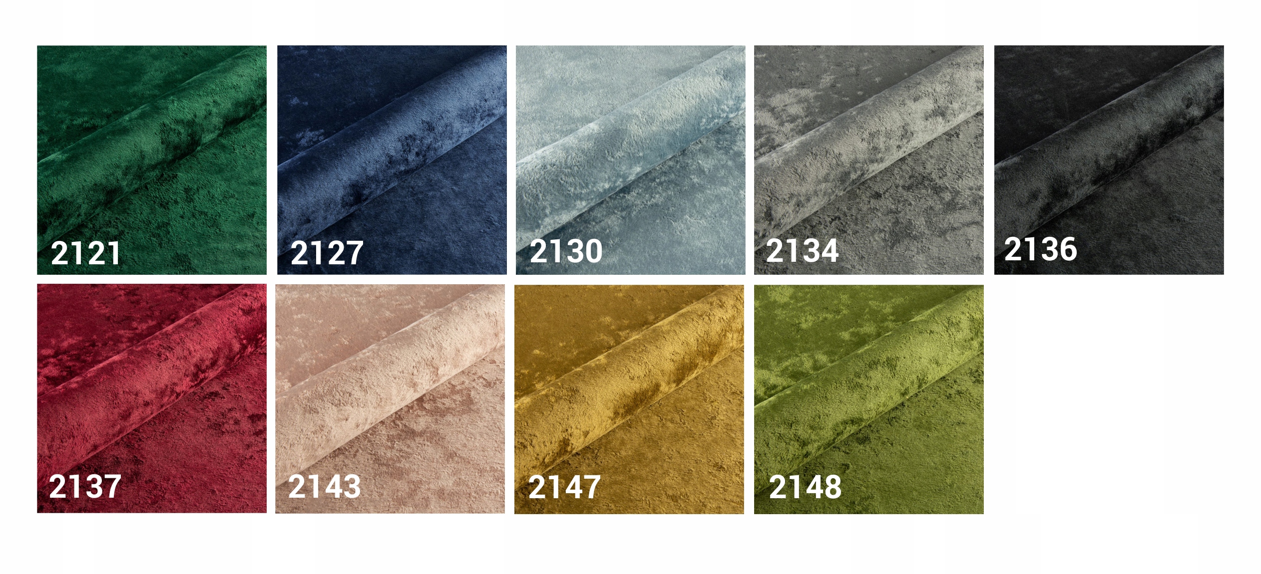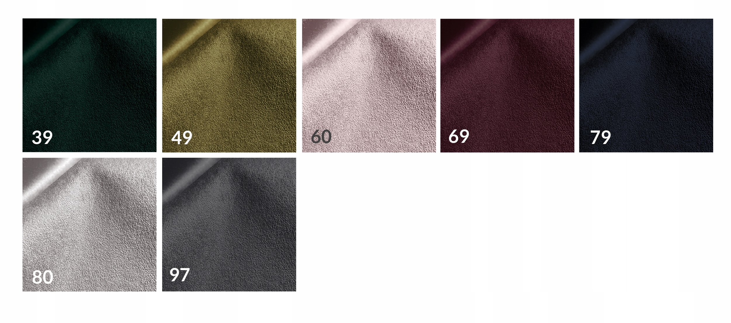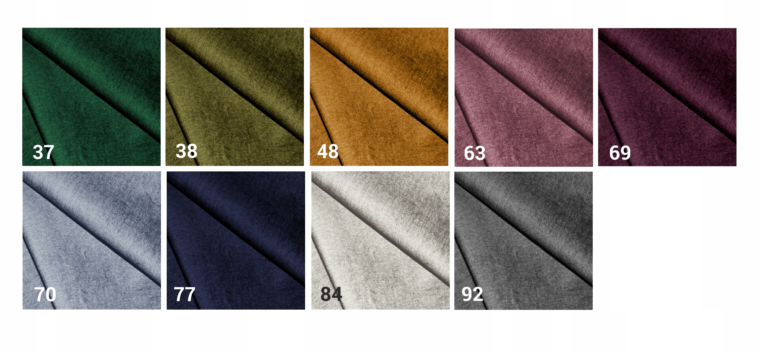 Matt Velvet – плюшева тканина з матовою структурою з непомітним переплетення ниток, з красивою обробкою. Має структуру тонкого, слизького пуху, на ньому легко писати. Він дуже приємний на дотик і має високу стійкість до стирання. Це водонепроникна тканина з ВОДООТШЛІКУЮЧИМ покриттям, що ускладнює вбирання рідини. Тканина покрита спеціальним захисним шаром, який створює гідрофобне покриття, що запобігає швидкому проникненню рідини. Це запобігає миттєвому вбиранню води тканиною, викликаючи конденсацію рідини на поверхні матеріалу. Це дає нам час, щоб обережно видалити розлиту рідину за допомогою м’якої тканини або паперового рушника. Тканина чудово підійде до будь-якого типу м'яких меблів. Очищайте лише м’якими засобами для догляду за м’якими меблями. Не прати, не прасувати та не відбілювати.