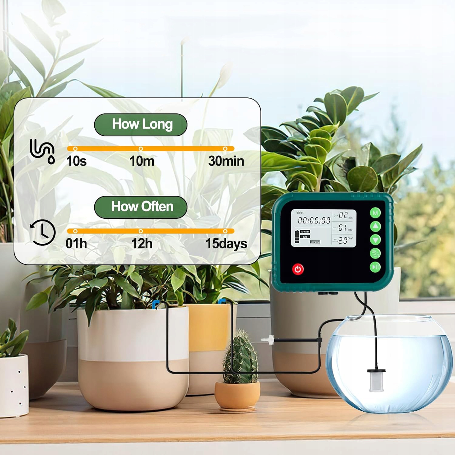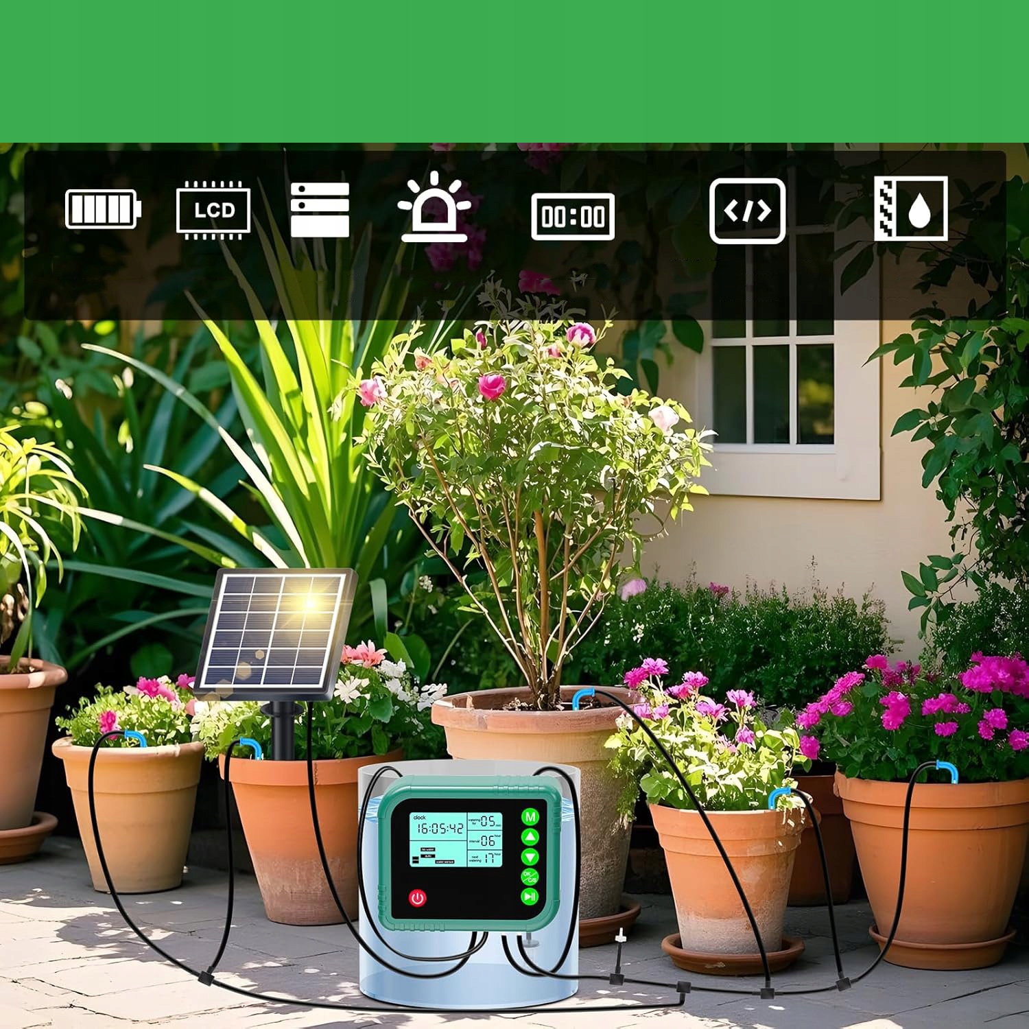 Під час програмування сонячної системи поливу налаштування автоматично зберігаються у внутрішній пам’яті. Навіть коли живлення вимкнено, користувальницьке програмування та налаштування залишаються в пам'яті. Вам не потрібно перепрограмувати таймер поливу щоразу, коли ви замінюєте батарею. Інтегрований контролер сонячного поливу має великий РК-дисплей та інтуїтивно зрозумілий інтерфейс користувача, який дуже легко читати та програмувати.