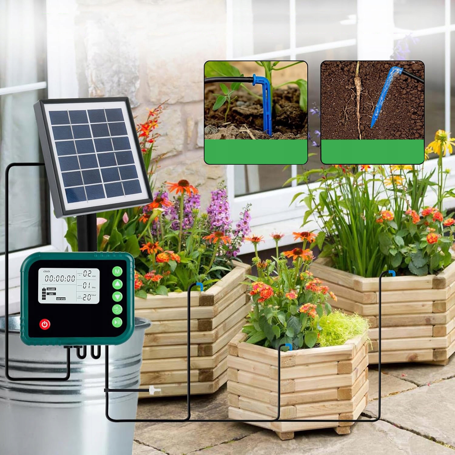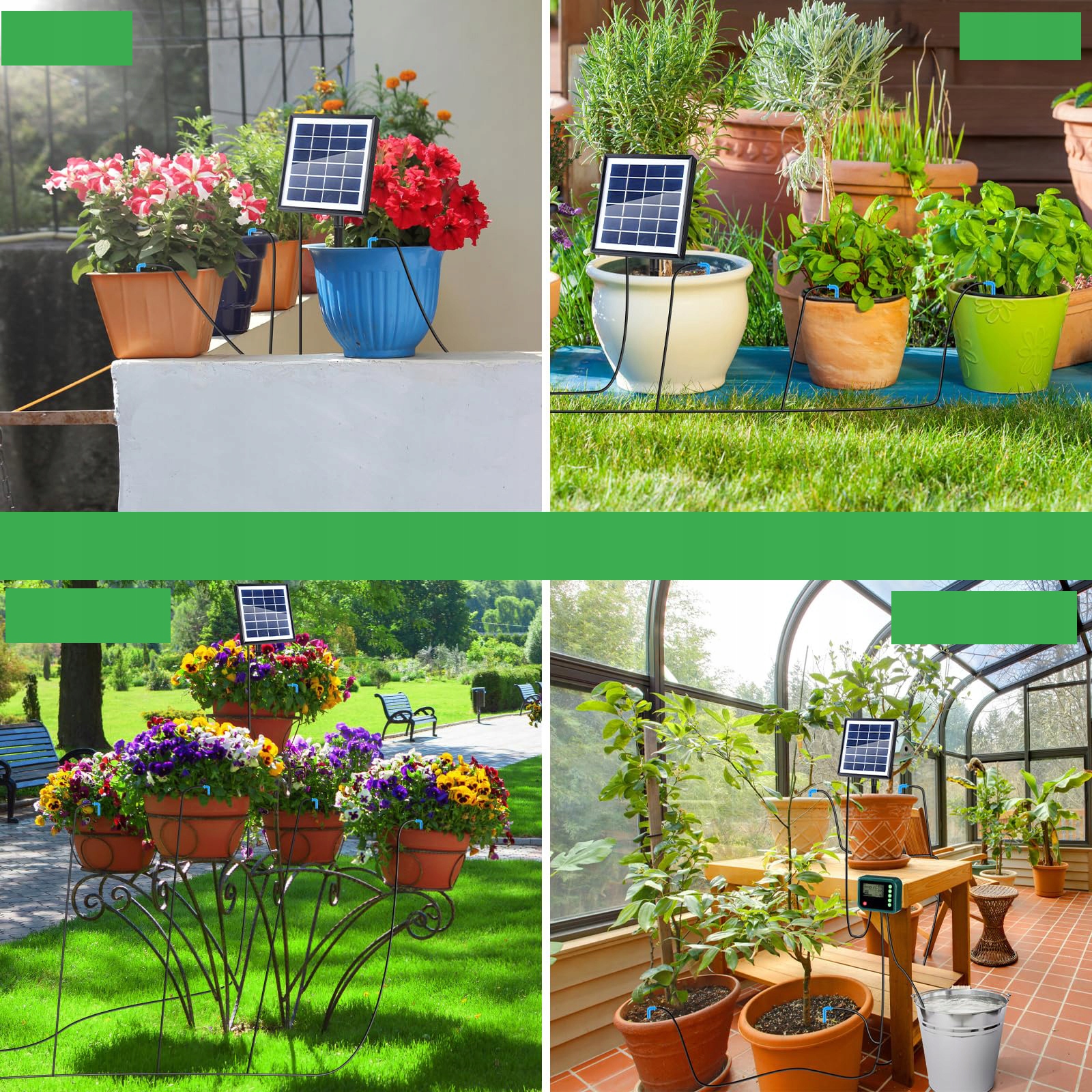 На відміну від інших систем поливу рослин, сонячна система використовує більш потужний насос, що забезпечує рівномірний полив до 15 рослин у горщиках. Підходить для поливу газонів, терас, садів, овочів, підвісних кошиків, рослин у горщиках, клумб, теплиць тощо. Полив повільний та рівномірний, що дозволяє рослинам краще рости.