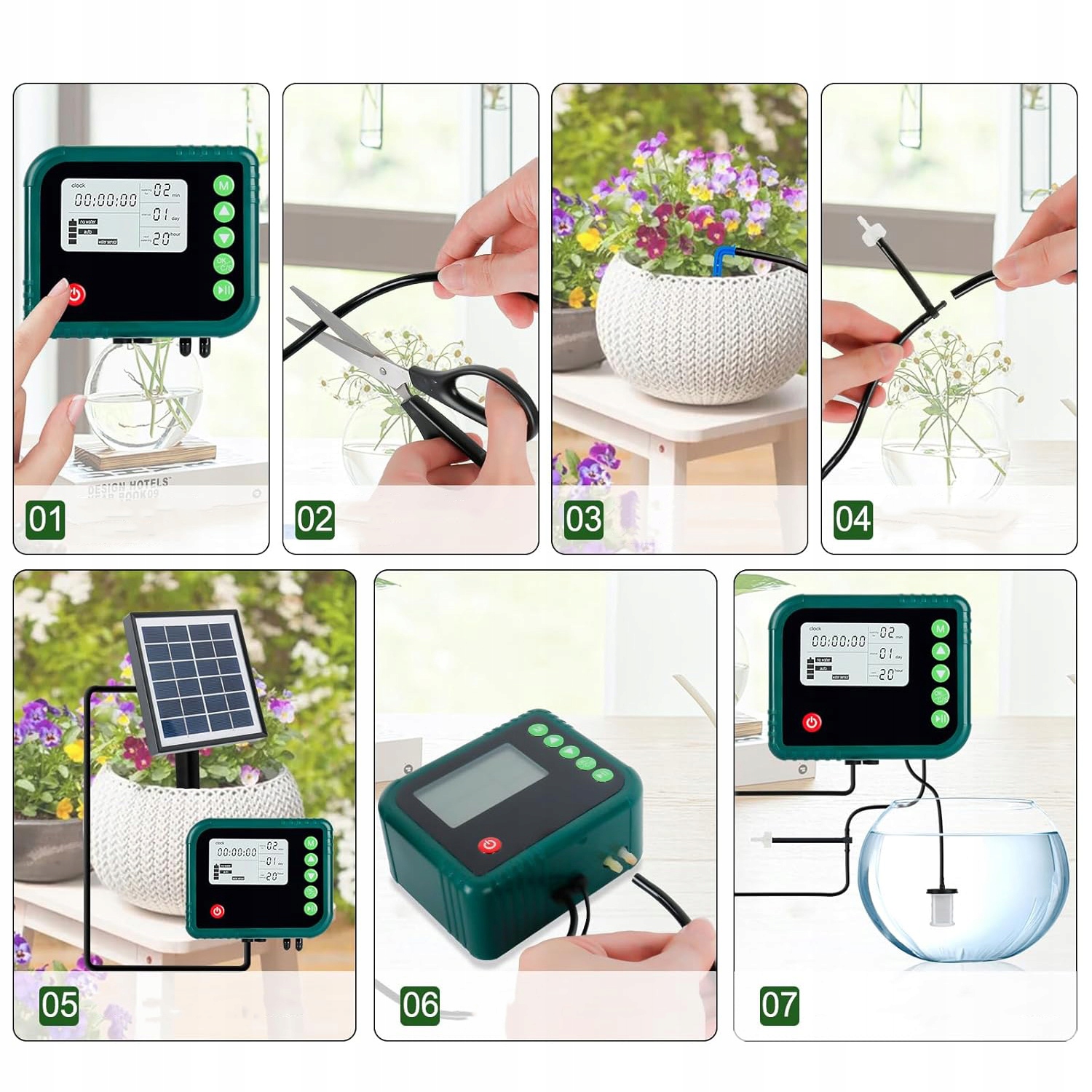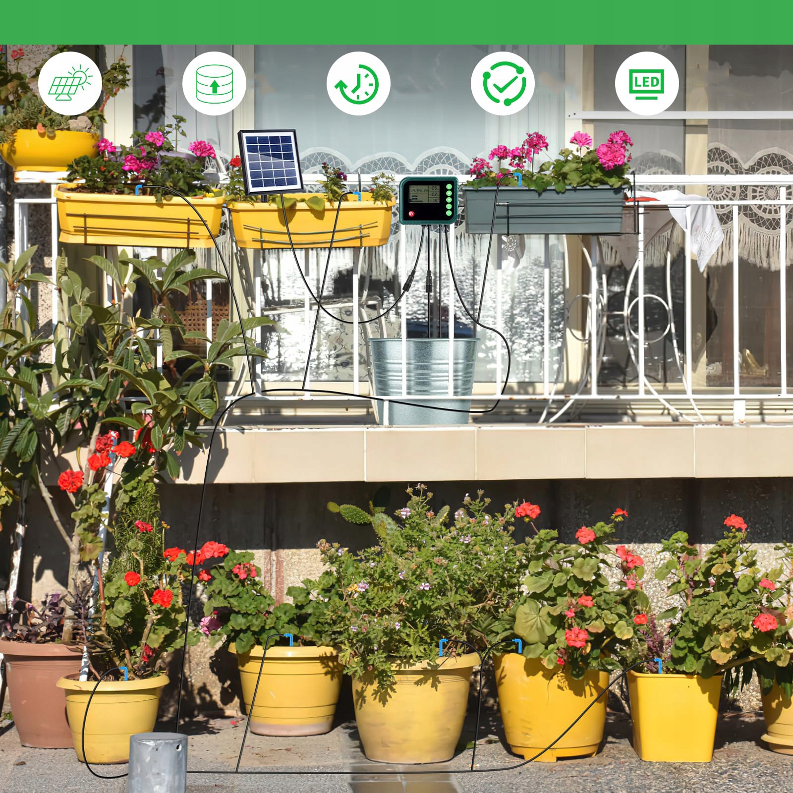 Наша система зрошення балконів підходить для поливу газонів, подвір’їв, садів, поливу овочів, підвісних кошиків, рослин у горщиках, клумб, оранжерей тощо. Незалежно від того, чи знаходяться ваші рослини в приміщенні, на відкритому повітрі чи в саду, сонячна система зрошення гарантує, що вашим рослинам завжди достатньо води, що дуже зручно. Забезпечте надійний полив своїх рослин незалежно від того, чи буде сонячно чи хмарно.