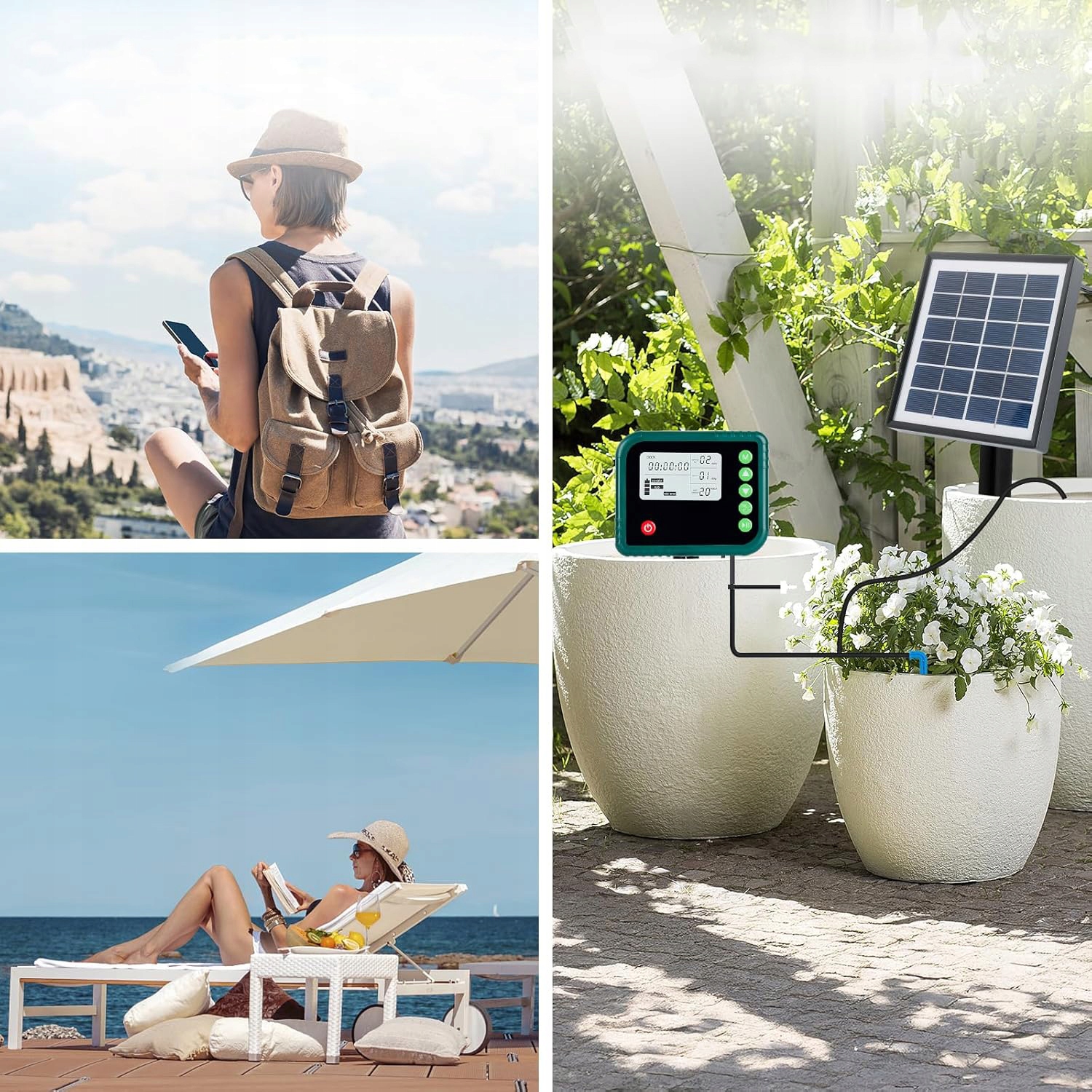 Ця сонячна система поливу забезпечує 40 разів поливу (1-30 хвилин, 10/15/20...55 секунд), 22 частоти (1/2/3/4/6/8/12 годин, 1-15 днів) і 880 режими крапельного зрошення для задоволення різних потреб у зрошенні та економії водних ресурсів. Сонячні батареї системи сонячного зрошення можуть працювати до 90 днів, дозволяючи вам насолоджуватися довгою щасливою відпусткою.