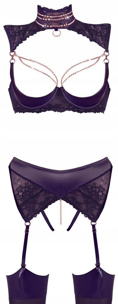 Комплект нижньої білизни, що складається з бюстгальтера, пояса для підв’язок і відкритих стрингів на промежину