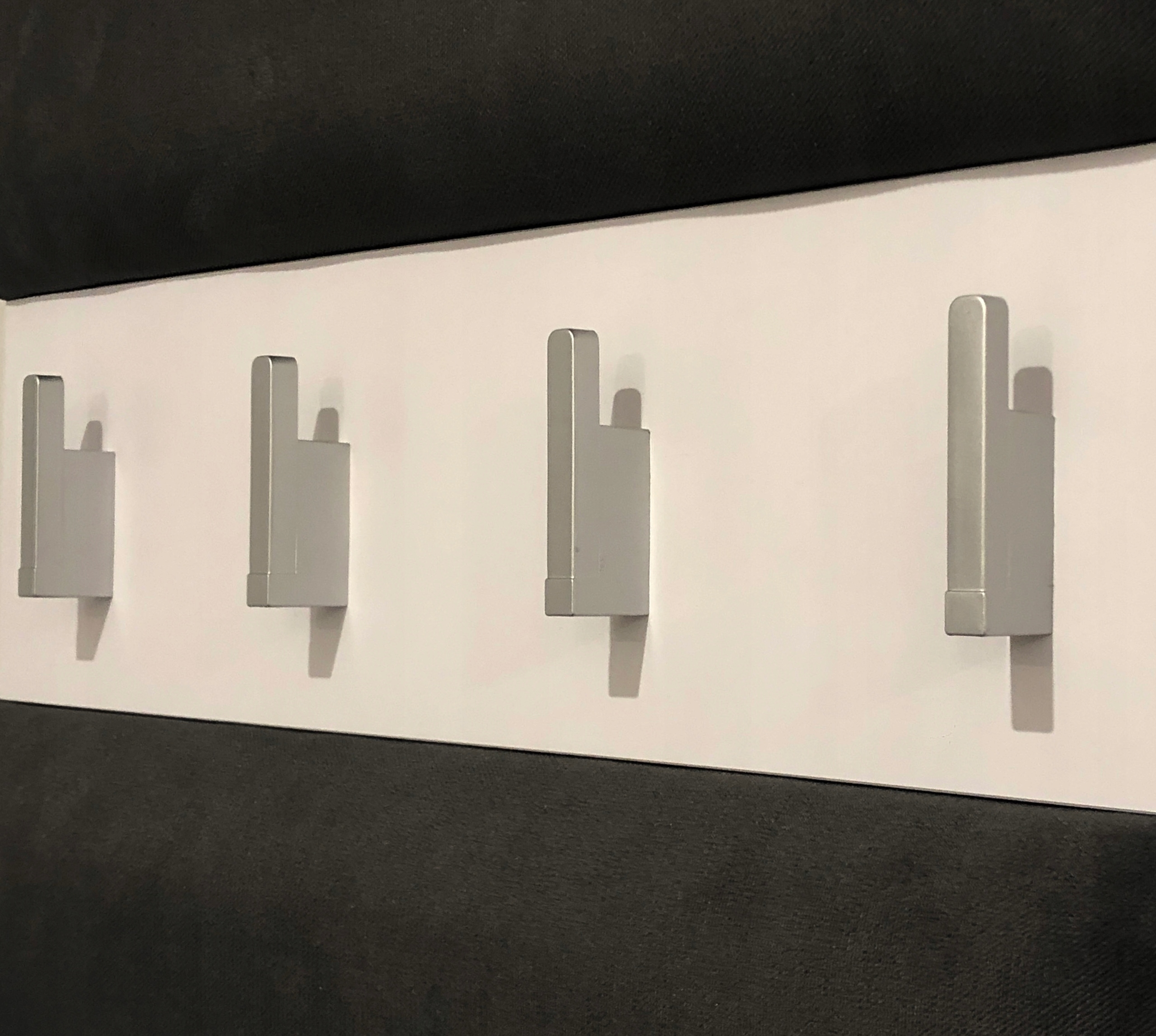 Ця мінімалістична проста вішалка має 50 см завширшки та 15 см заввишки. Ми використали чотири сучасні гачки, на які можна повісити куртки або пальто. Ця вішалка підійде для невеликих прихожих, оскільки завдяки своїм розмірам вона не займе багато місця. Але якщо вам потрібно більше місця ви можете придбати більше деталей і встановити їх в одну лінію, створивши сучасне оздоблення вашого залу.