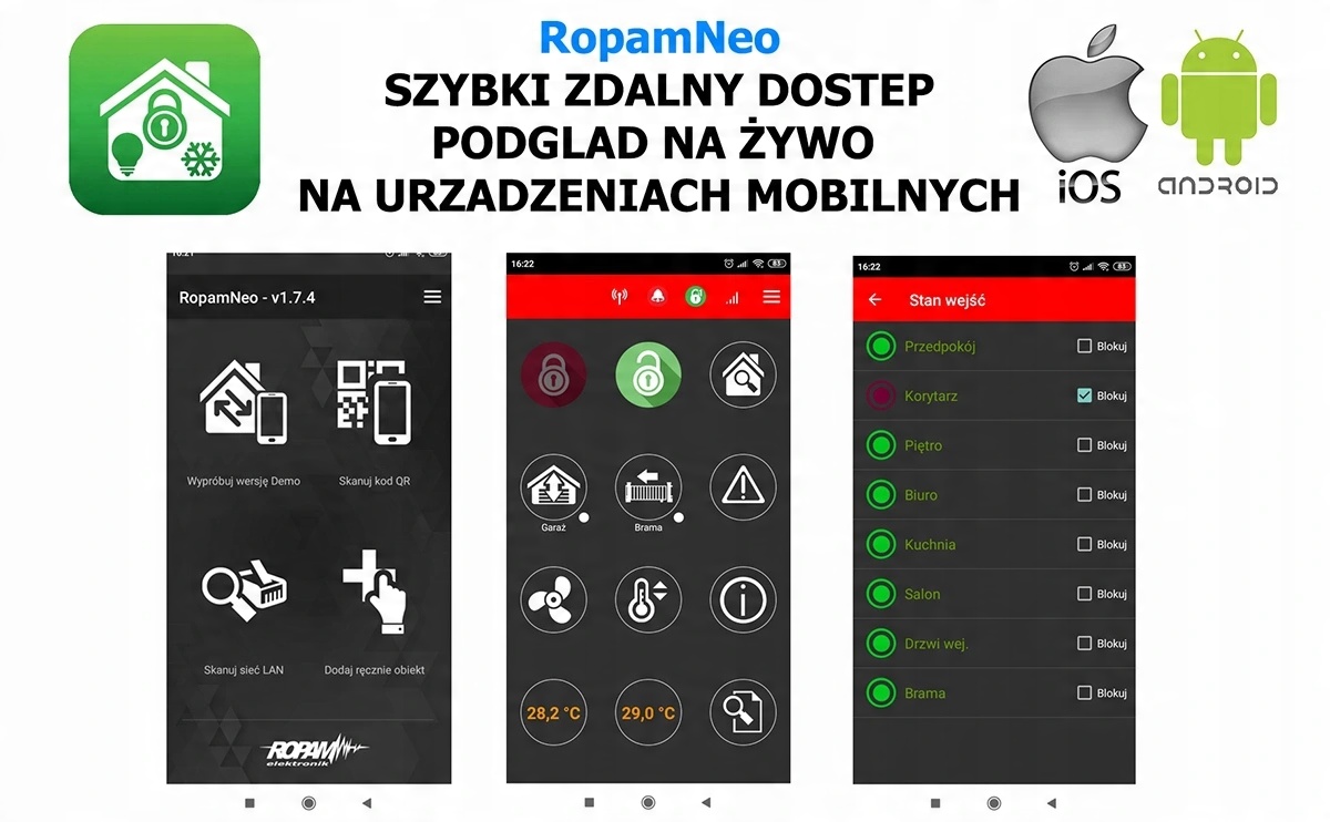 Великою перевагою ППК NeoGSM-IP є можливість дистанційного керування, з додатком рівня RopamNeo (Android). Додаток характеризується високою функціональністю та інтуїтивно зрозумілим, повністю настроюваним інтерфейсом (UI), що робить щоденне використання системи простим і приємним. Користувач керує системою за допомогою віджетів або голосових команд. Він також має можливість створювати макрокоманди, які запускають наступні послідовності функцій.