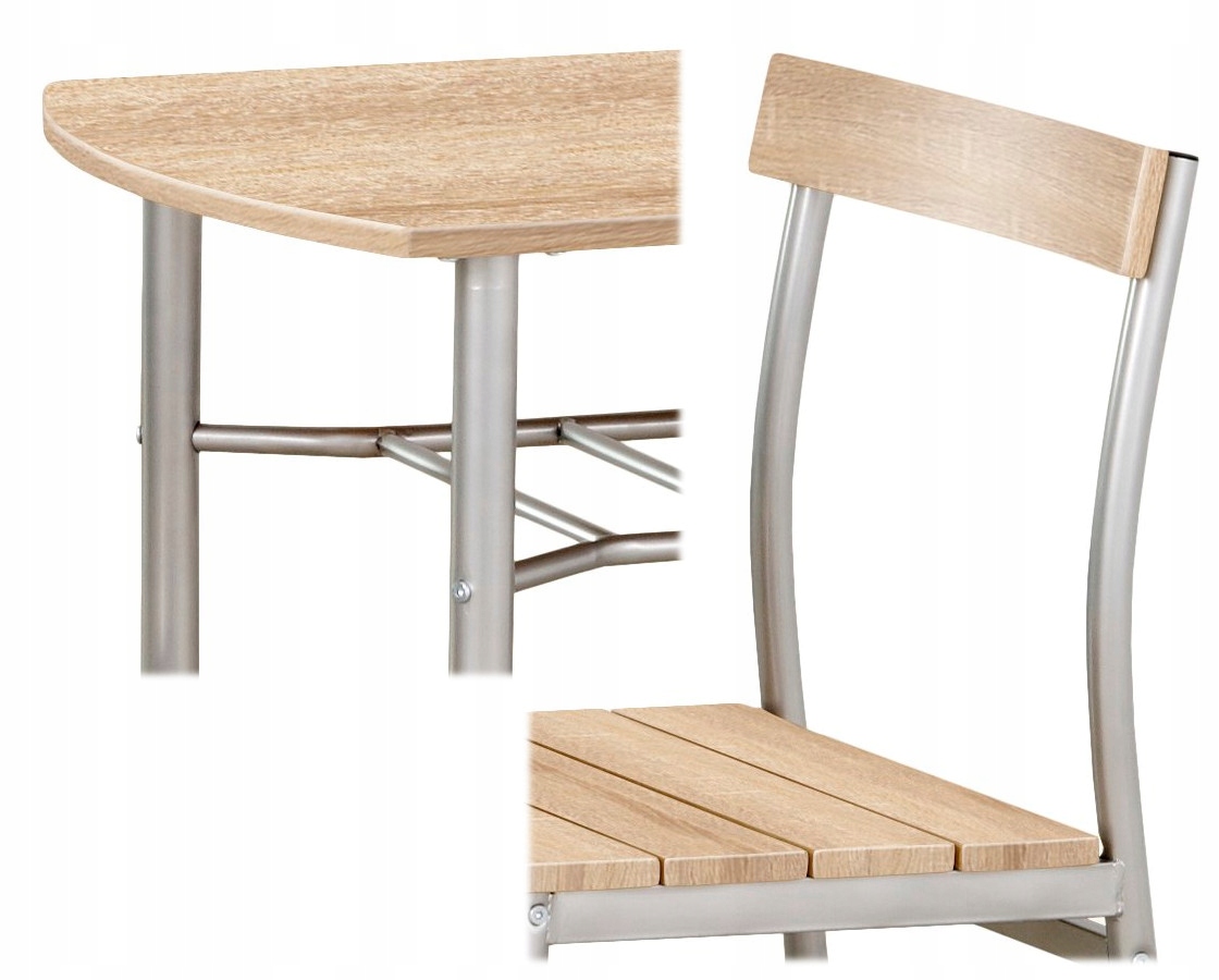 Гарнітур для кухні, їдальні або вітальні. Ідеально підходить для невеликих кімнат або квартир (студій). Легко підтримувати в чистоті. Сидіння стільців і стільниця з ламінованої МДФ плити. Ніжки та рами виготовлені зі сталі порошково. Під стільницею є функціональна полиця.