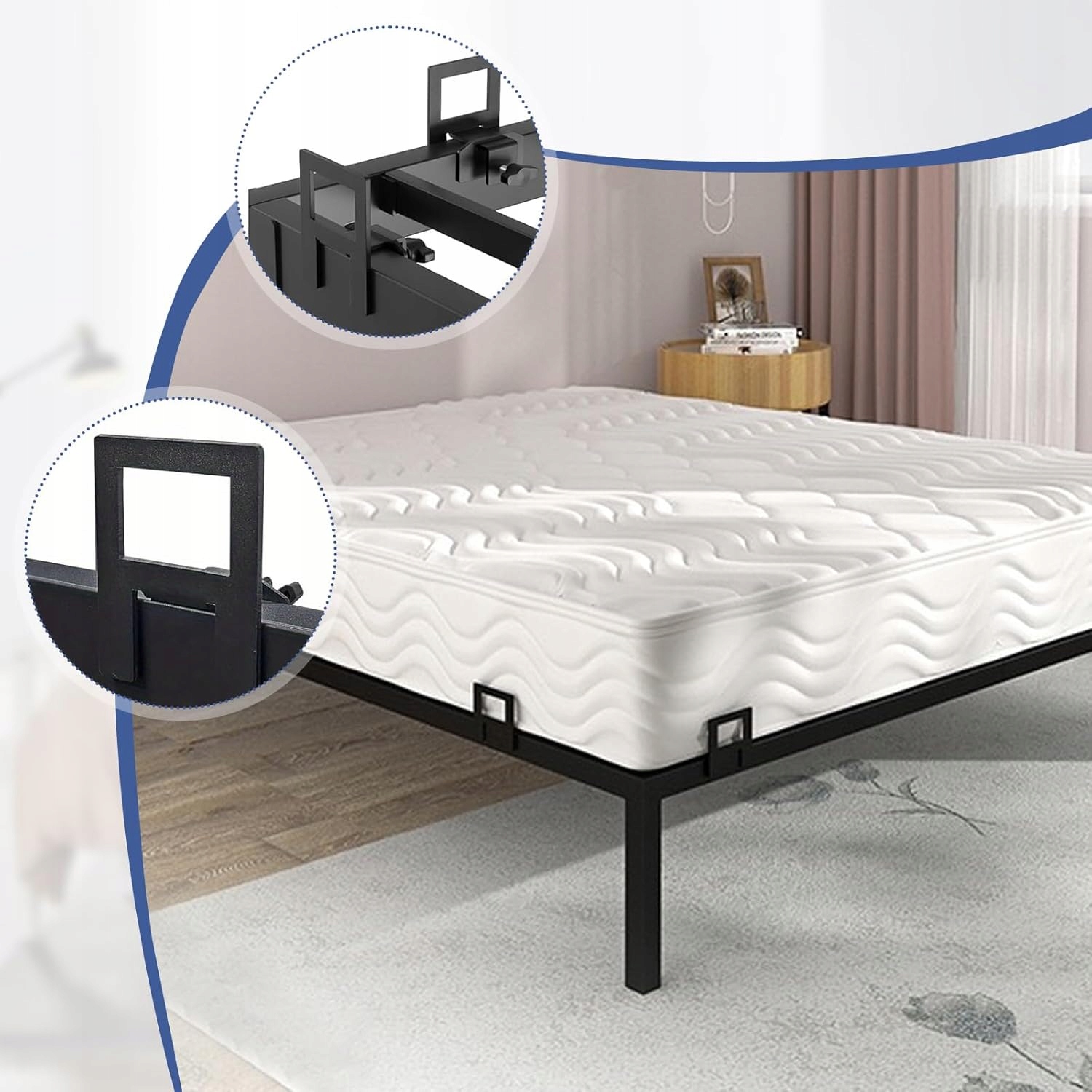 - Наш регульований тримач для матраца підходить для будь-якого тримача ліжка. Регулювальний гвинт дозволяє легко відрегулювати посадку, забезпечуючи сумісність з різними стилями сну. Цей тримач для матраца допомагає рівномірно розподілити вагу, зменшуючи навантаження на основу підлоги та забезпечуючи довговічність.