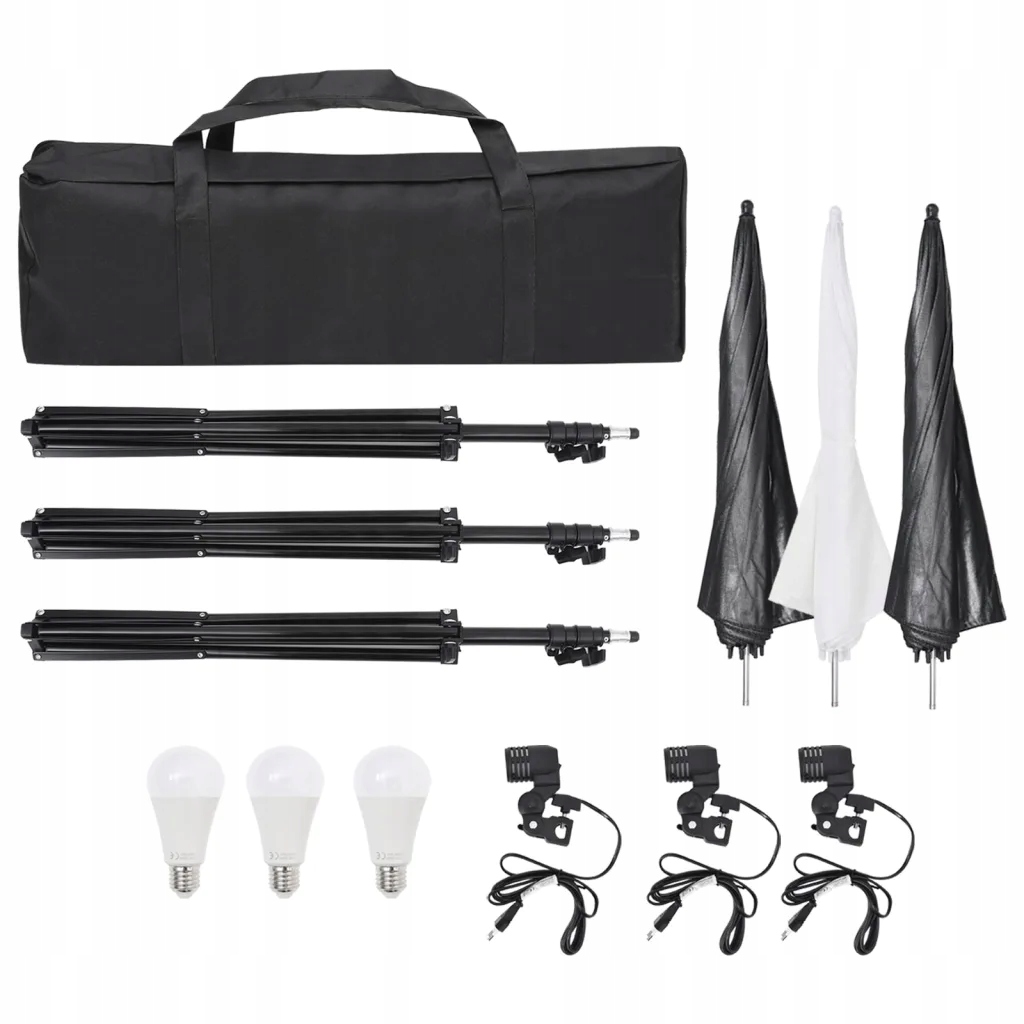 Набір освітлення складається з 3 ламп денного світла, 3 тримачів, 3 штативів і 3 парасольок (1 білий, 2 сріблястий). Він підходить для фото- та відеозйомок і його легко носити.