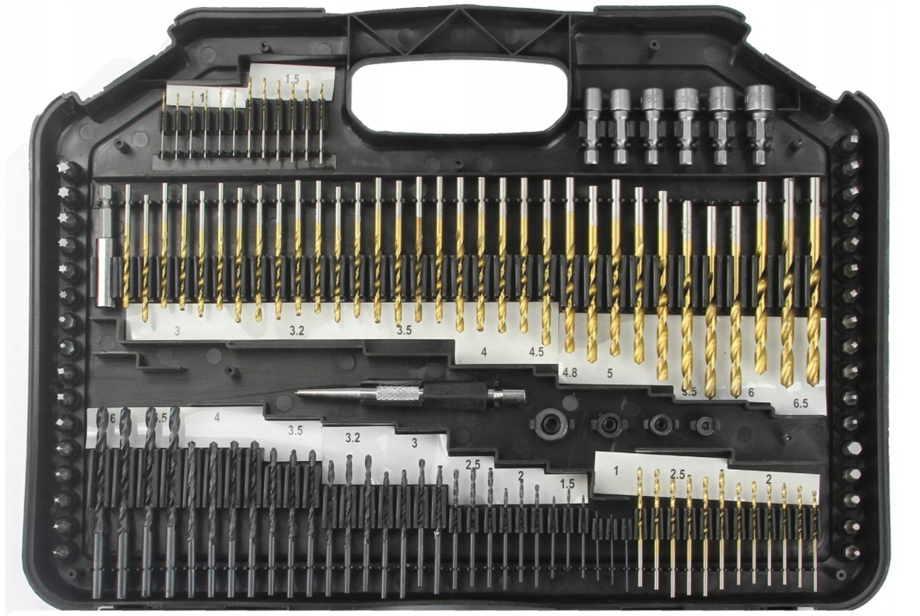 У набір входять свердла по дереву, свердла по металу , свердла по бетону, наконечники, свердла ручні, пилки діркові, насадки, головки під шестигранник, зенкери, шестигранний ключ, перехідники.