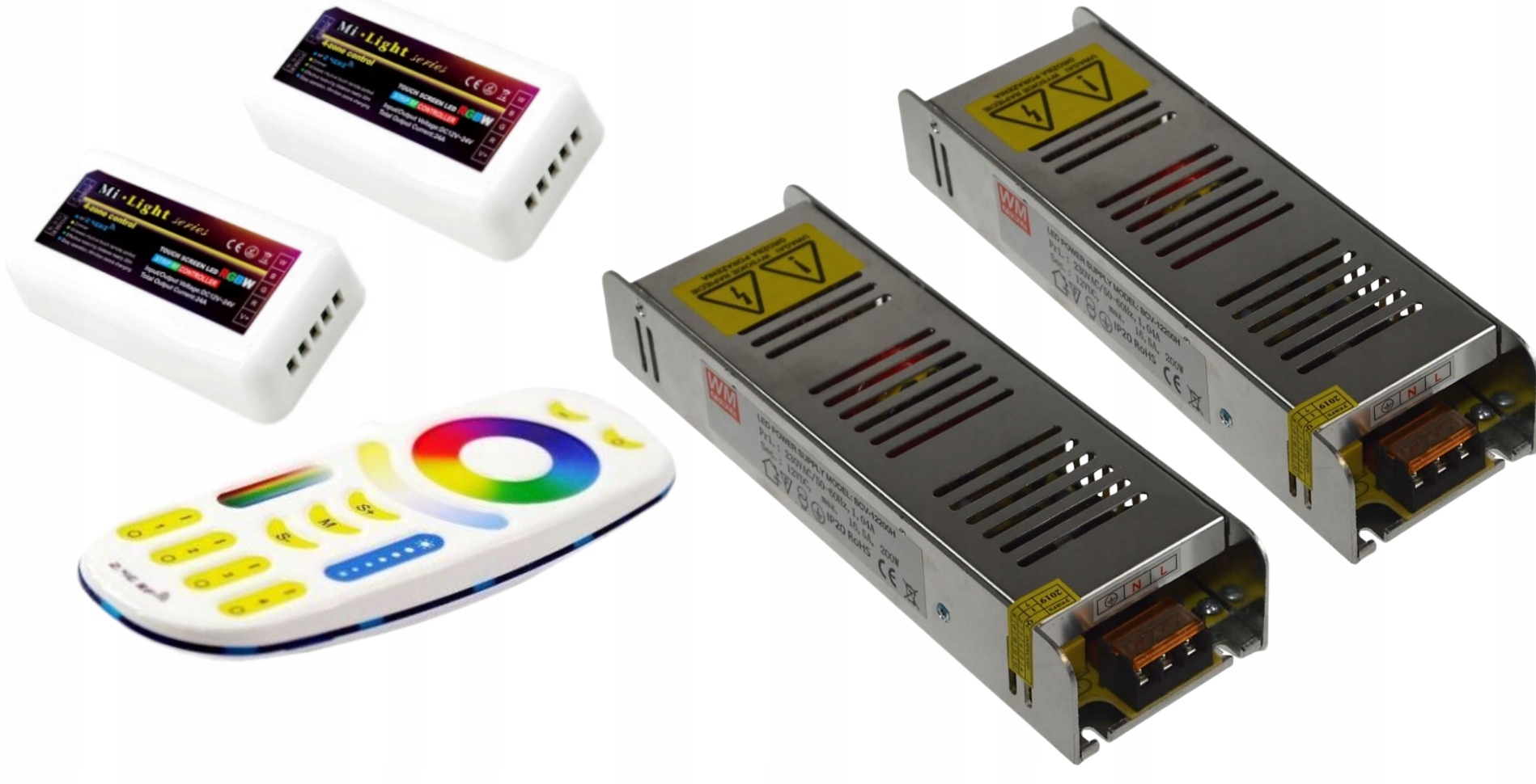В набір входять приймачі PREMIUMбездротова система Mi-Light. Використовуючи відповідний WiFi Hub/Router, ви можете також можна керувати сеткою зі смартфона (Android та iOS) - WiFi Hub. Завдяки цій системі ви можете створити дві окремі зони та керувати ними за допомогою одного пульта.