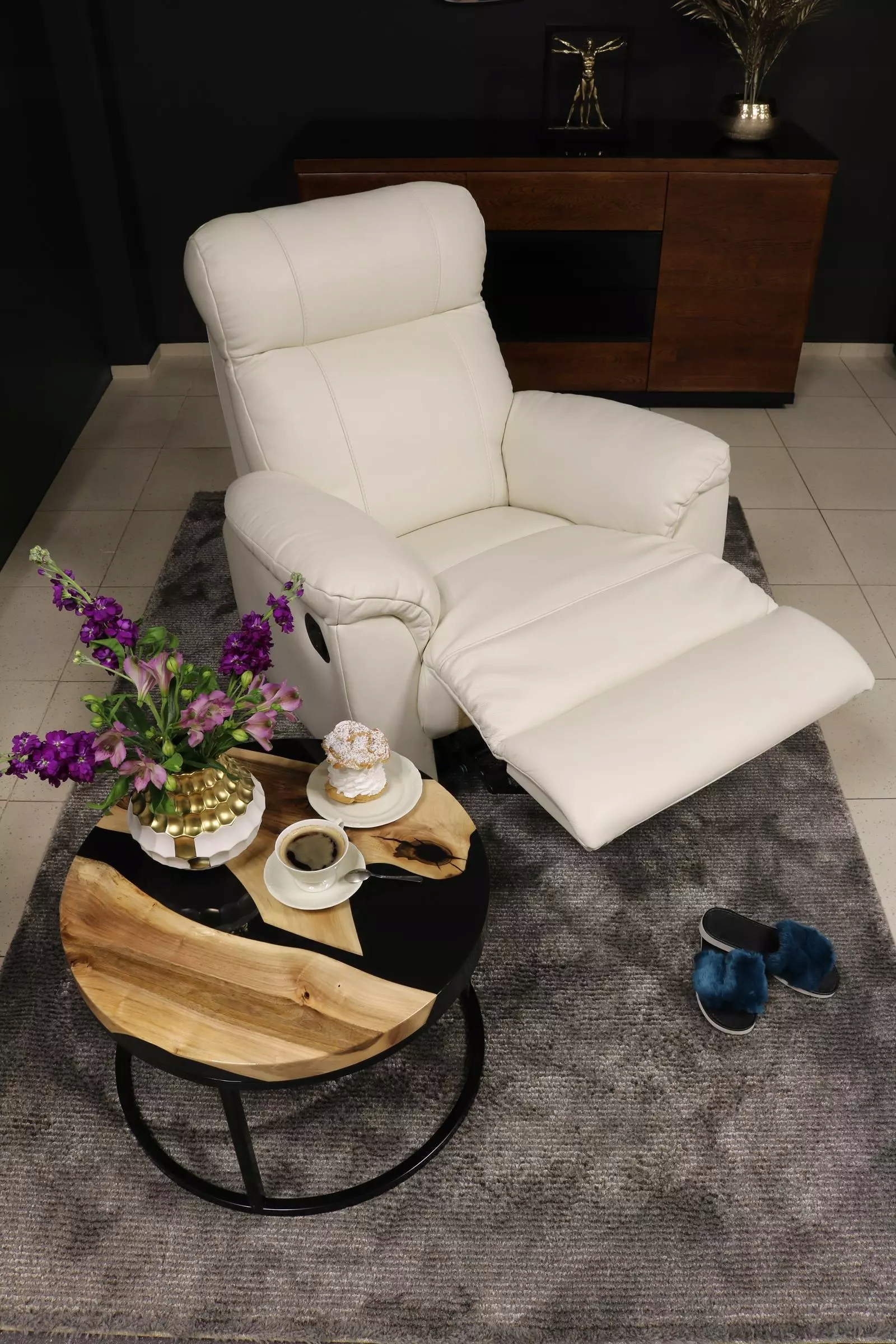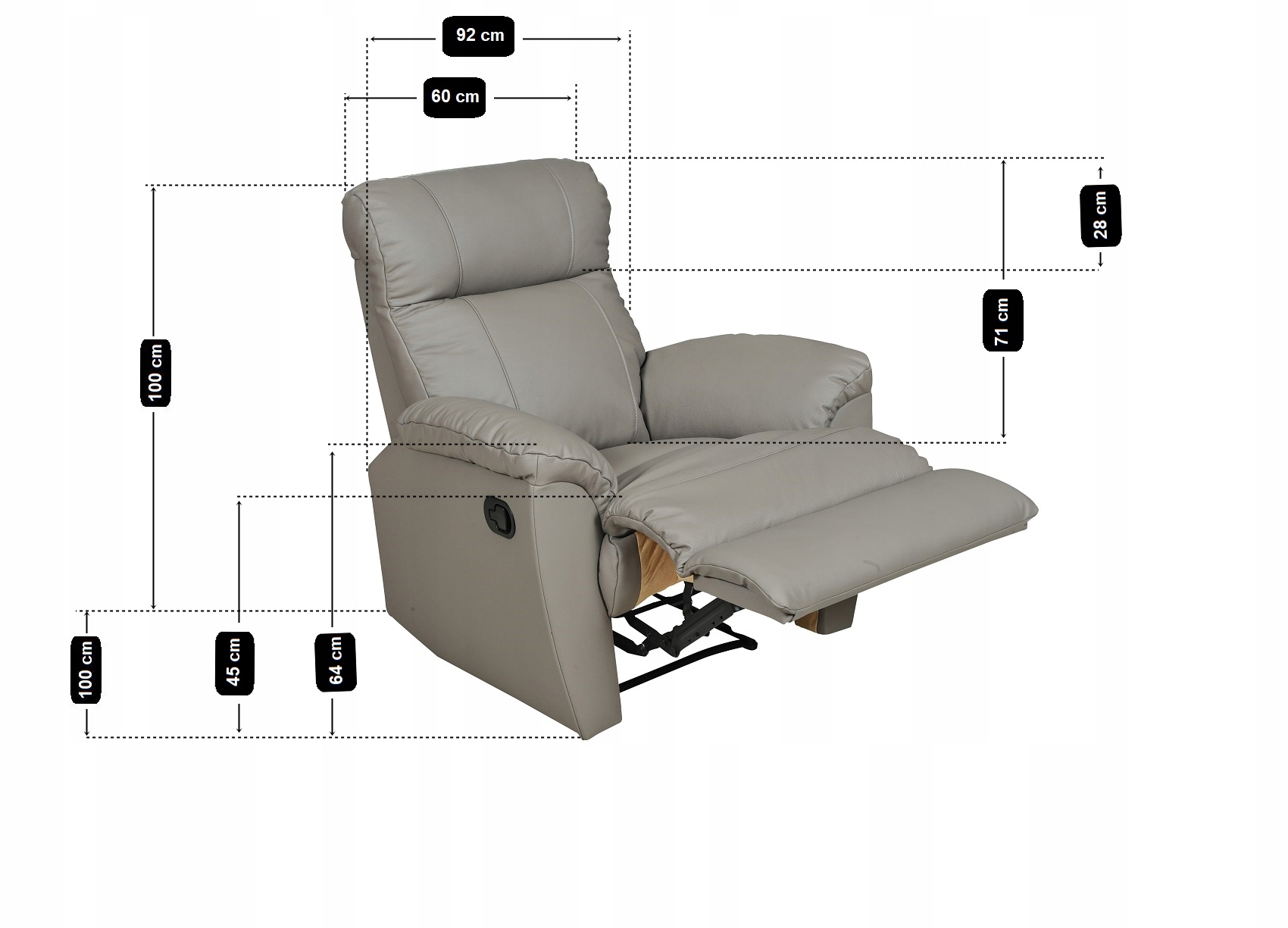 У цьому варіанті підніжка розкладена, а спинка трохи нахилена. Ідеальне положення для відпочинку, читання або перегляду телевізора.