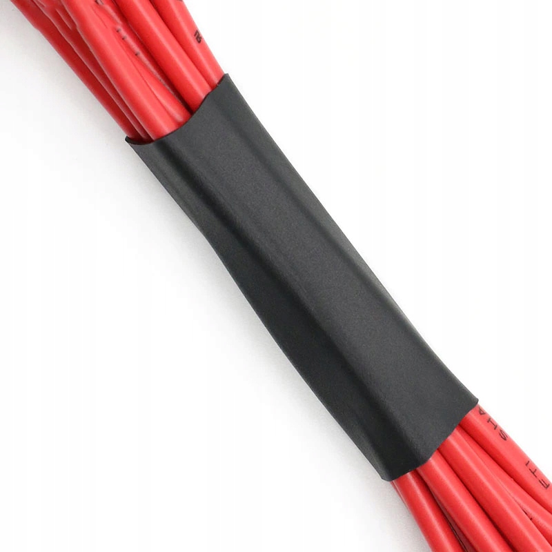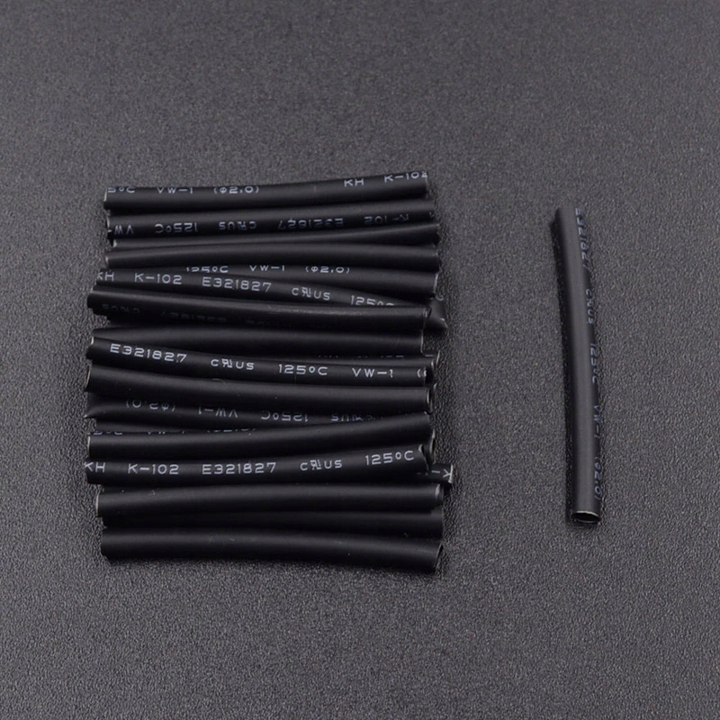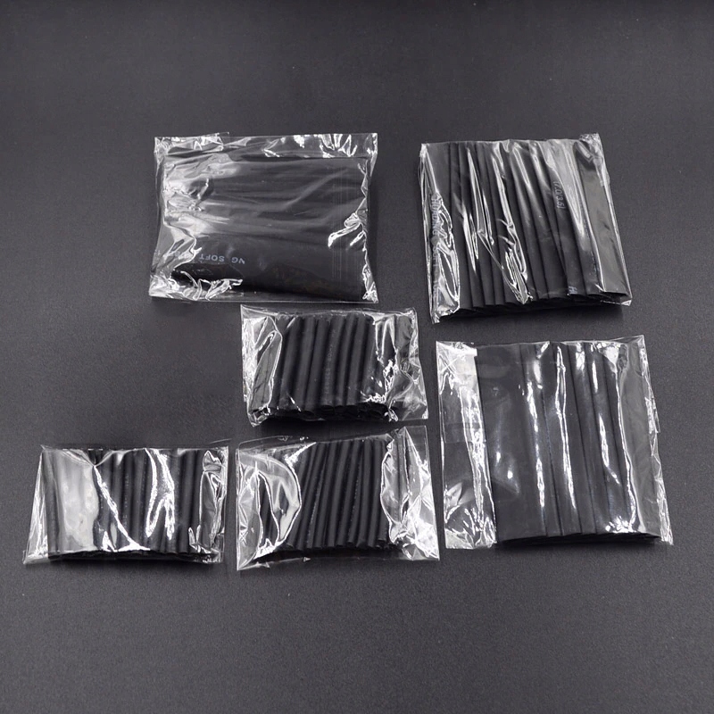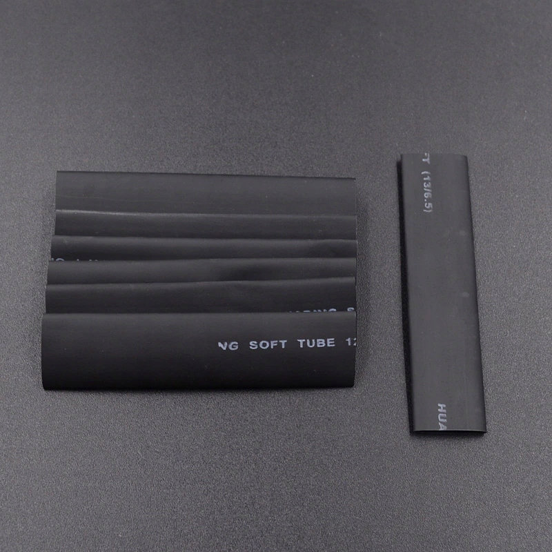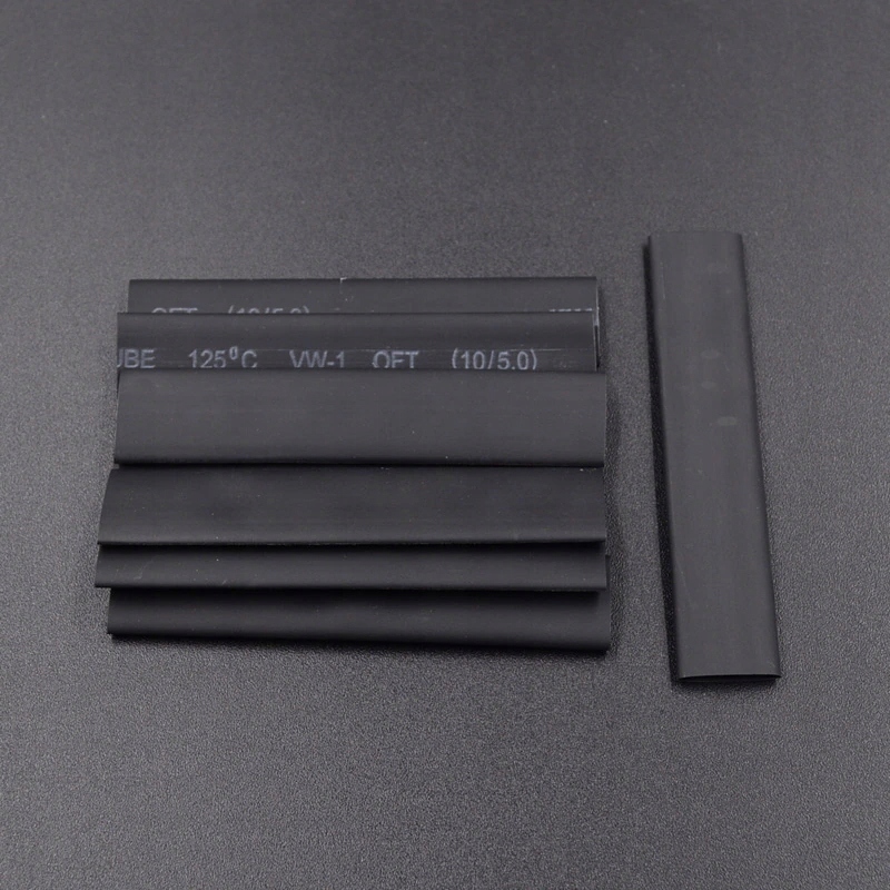 Набір чорних термозбіжних трубок довжиною від 40 мм до 85 мм і діаметром від 2 мм до 13 мм. Для ізоляції електричних кабелів найчастіше використовують трубки. Вони також використовуються при виготовленні джгутів.