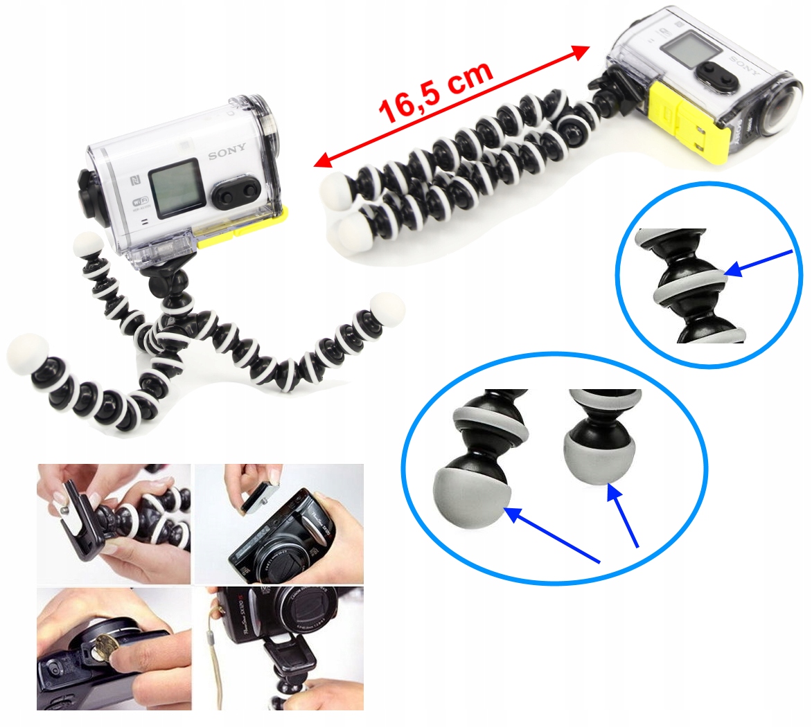 - гнучкий (штатив/тринога) для розміщення камери навіть на дуже нерівній поверхні