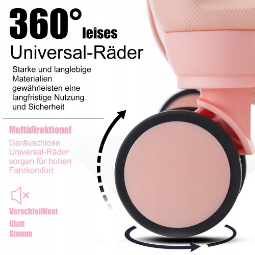 Тихі колеса, які обертаються на 360 градусів: ця валіза працює тихо. Колеса на 360 градусів, тож ви може легко маневрувати в переповнених аеропортах або на вокзалах. Вони тихі при їзді та поворотах. Обидва колеса мають гальма.