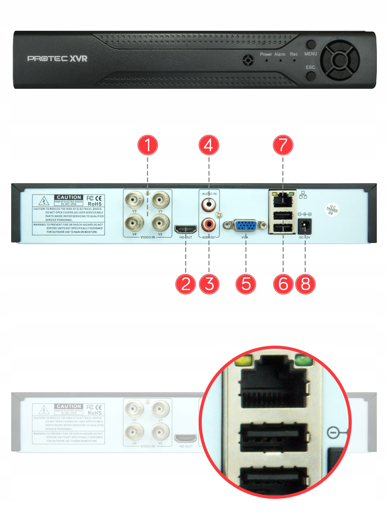 USB-роз’єми дозволяють зручно підключати мишу для керування рекордером (USB-миша входить до комплекту), а також одночасно під’єднувати портативну пам’ять для завантаження записів із камер.