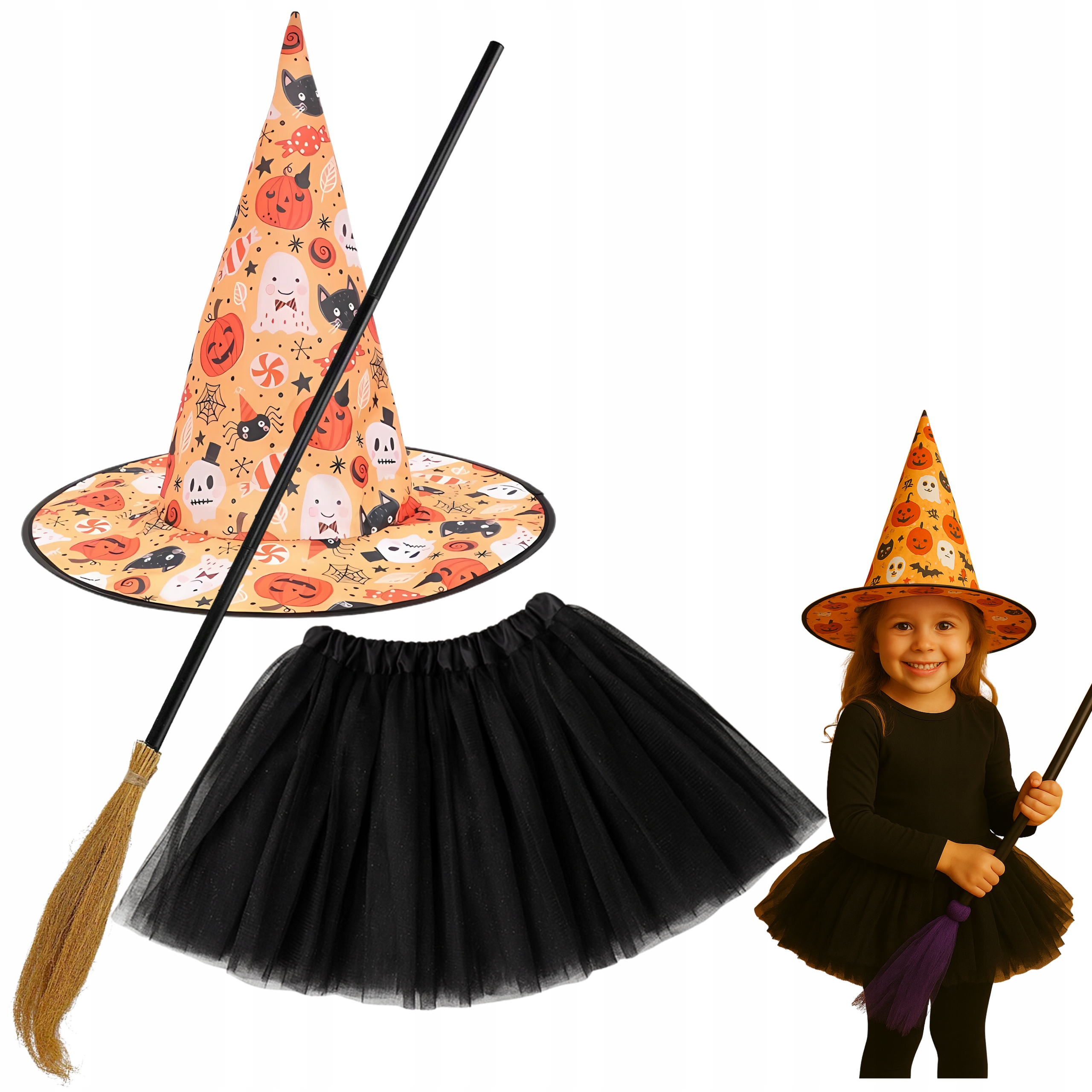✅Набір відьми - ідеальне доповнення до хеллоуїнських і карнавальних стилізаційдля дітей. У набір входить помаранчева шапочка з мотивами гарбуза, привида та кажана, легка мітла довжиною 100 см і спідниця-пачка.