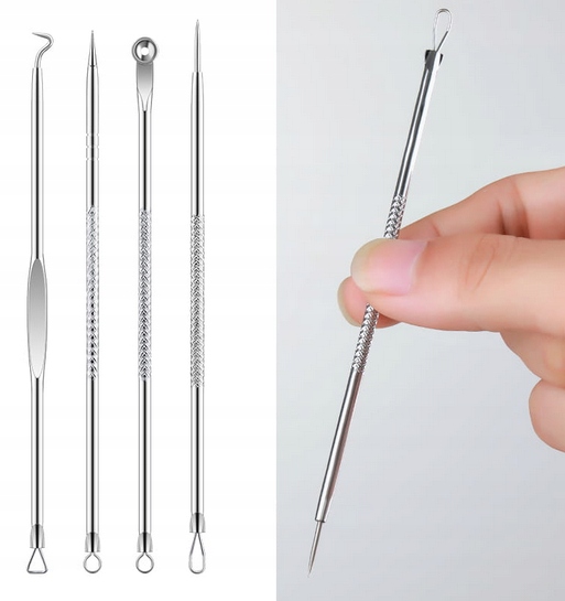 - 4 двосторонніх ложки для безпечного видалення чорних крапок, вугрів і прищів