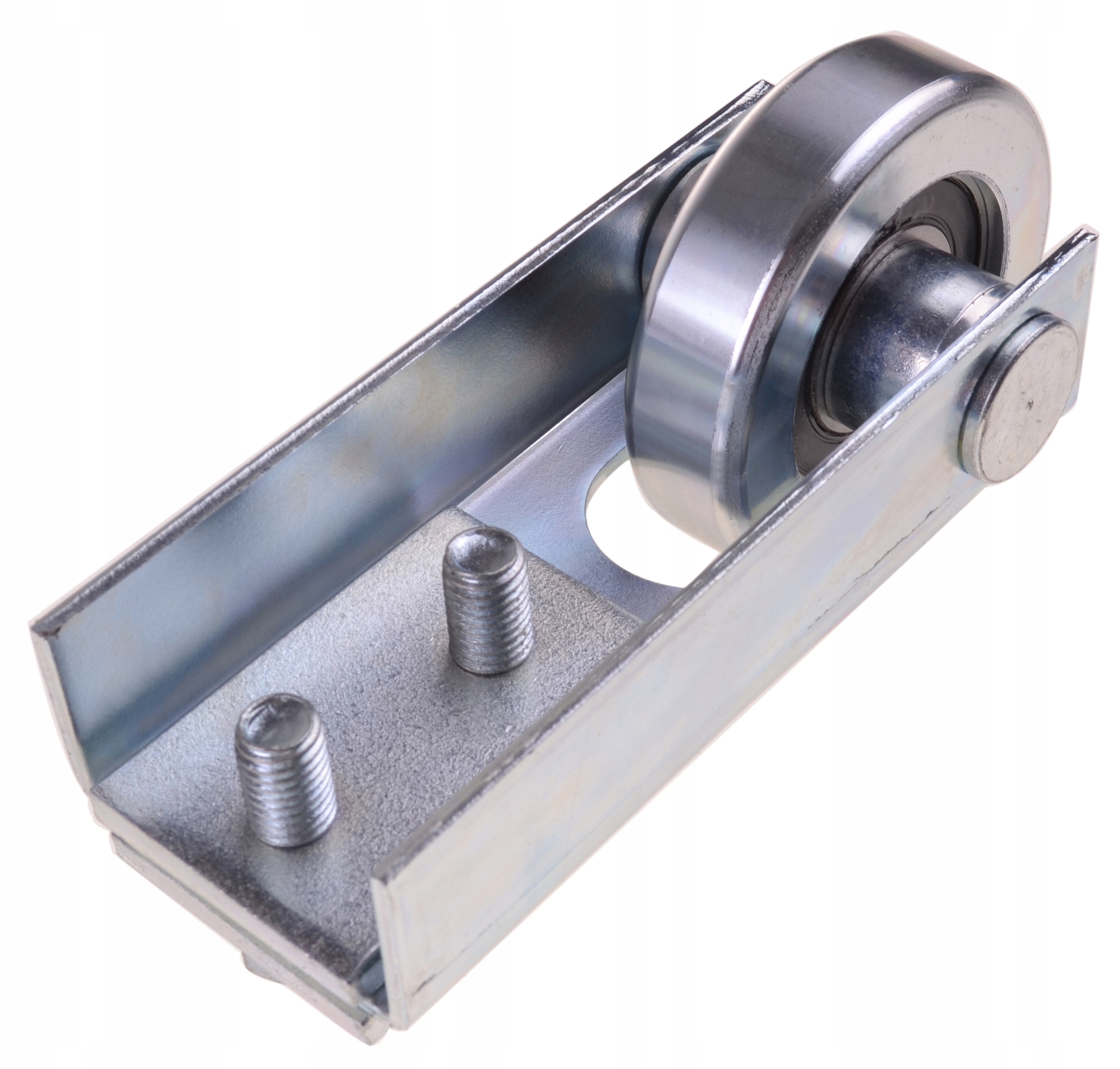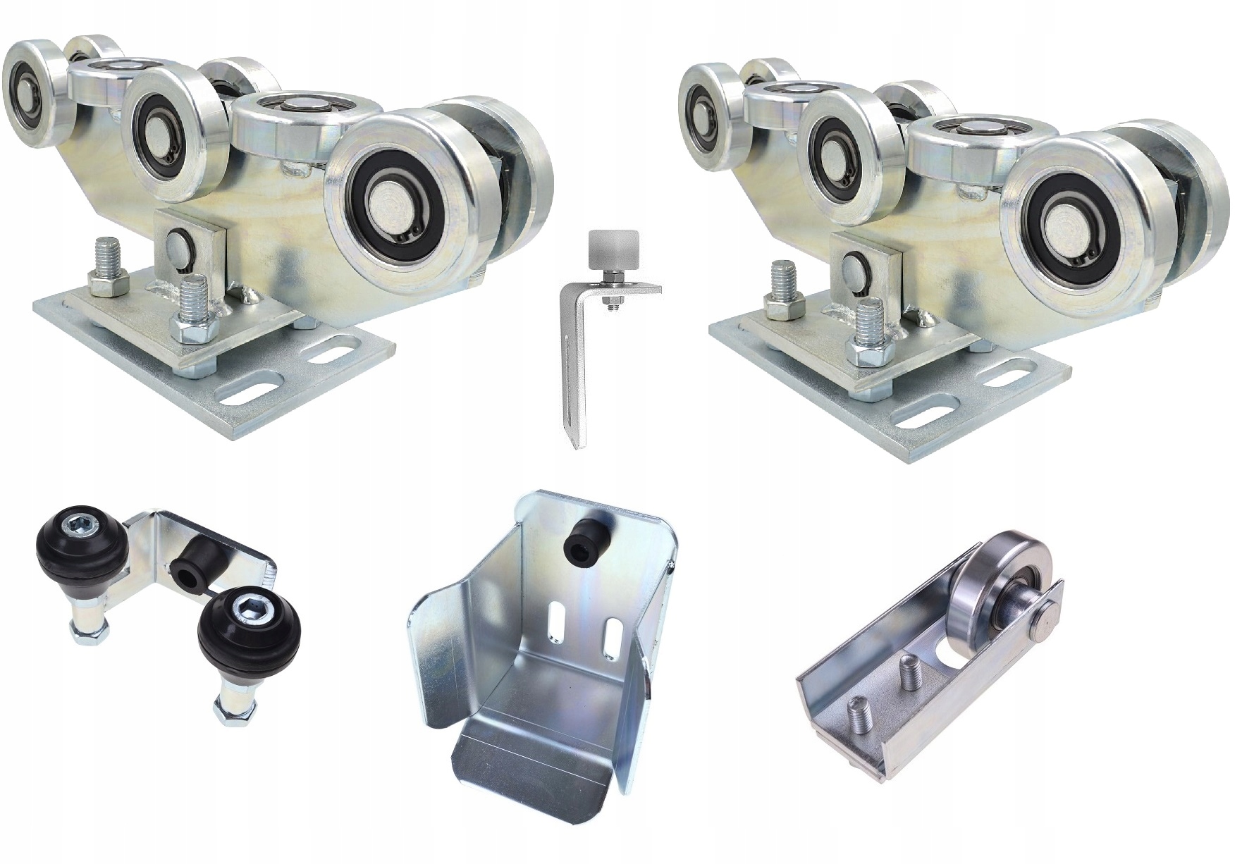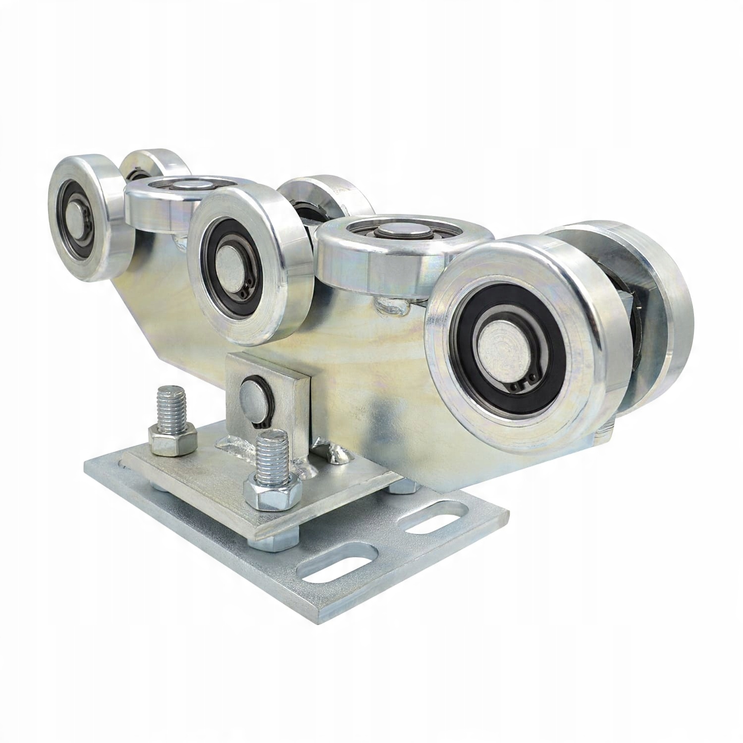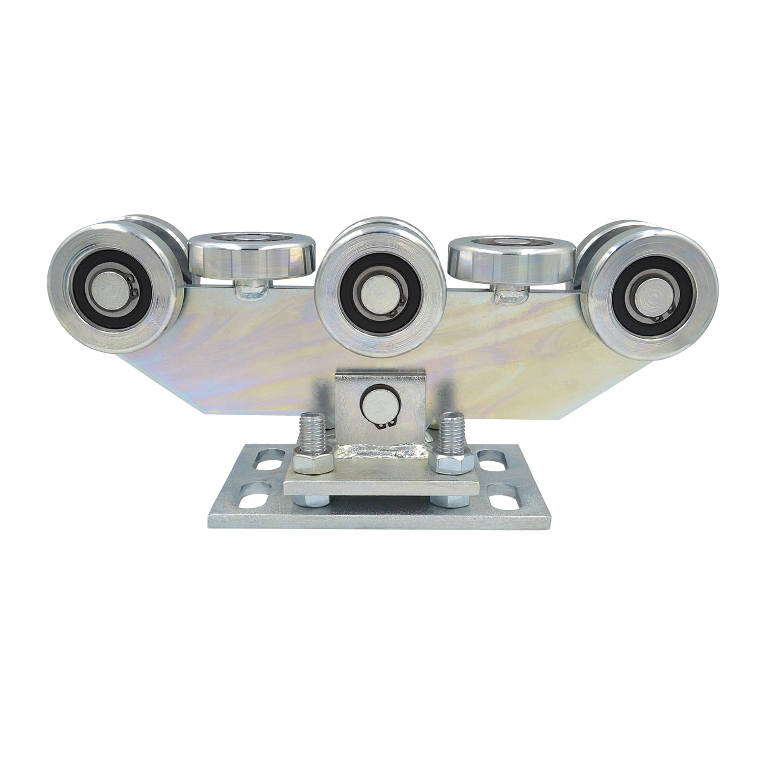 Рухомий візок (дві штуки) з 8 металевими роликами (включаючи один горизонтальний ролик). Візок коливається і адаптується до відкатних воріт (з'єднується з основою шпилькою). Він також регулюється по висоті за допомогою гвинтів. Розрахований на рейку 80x80x5 мм. Оцинкований виріб.
