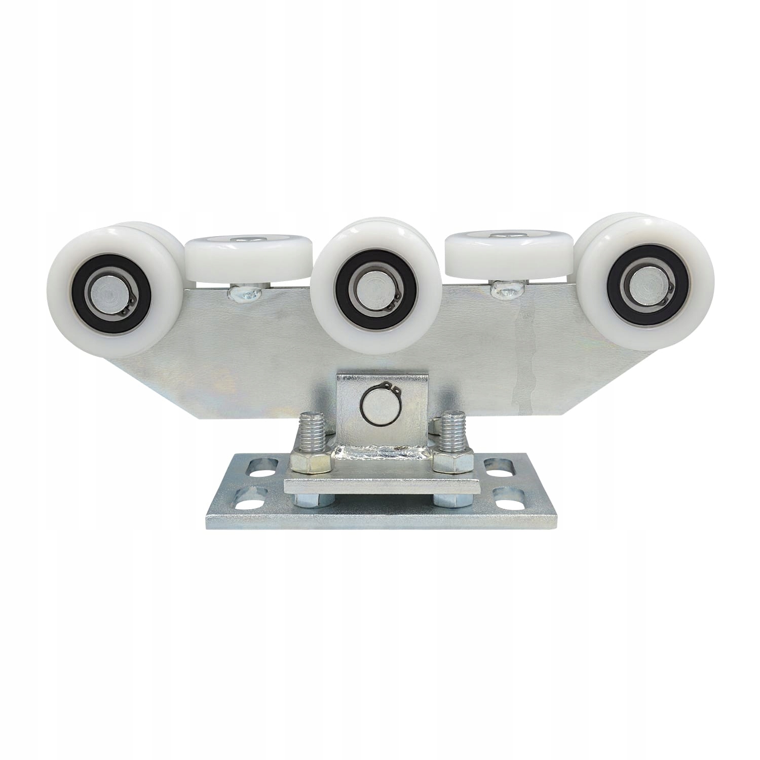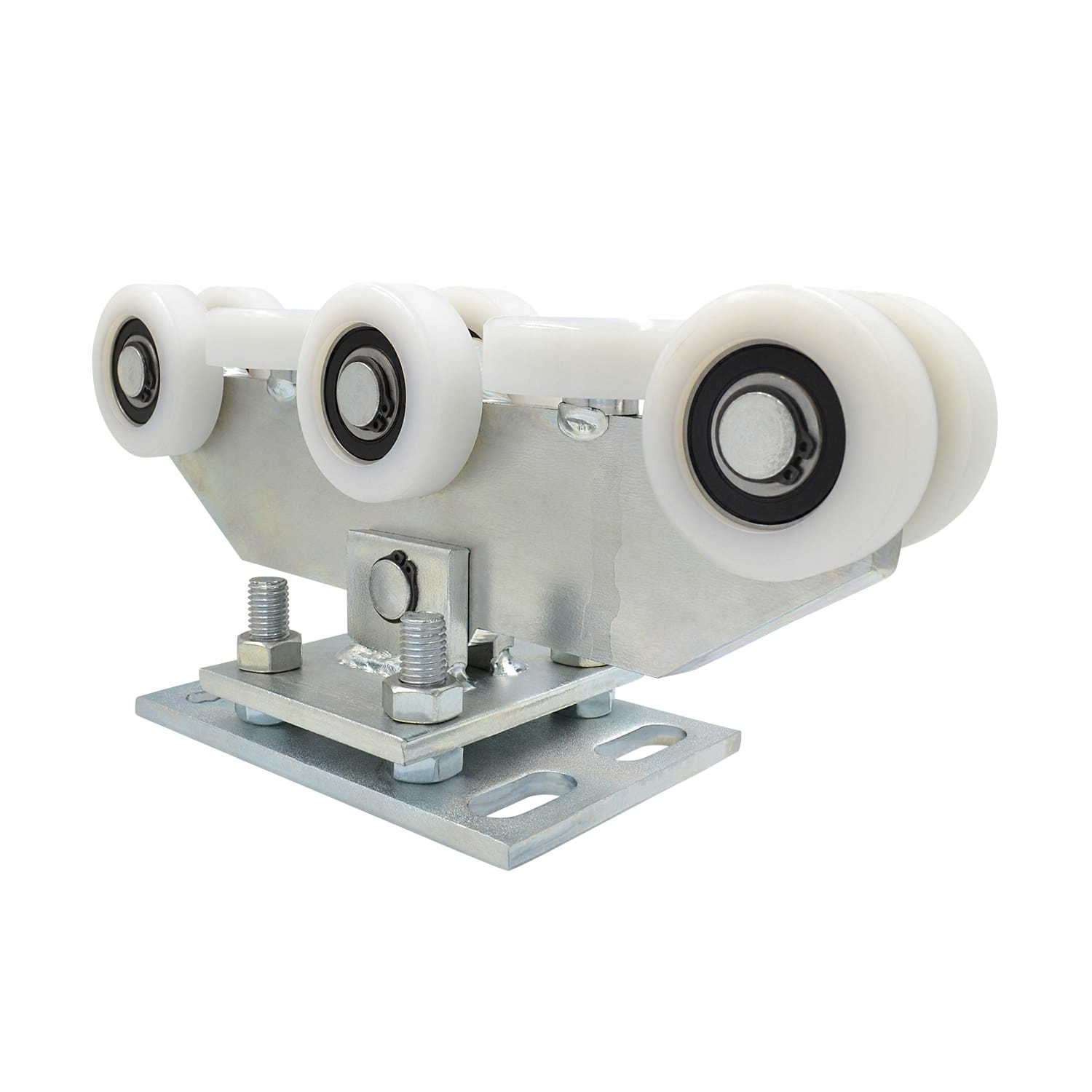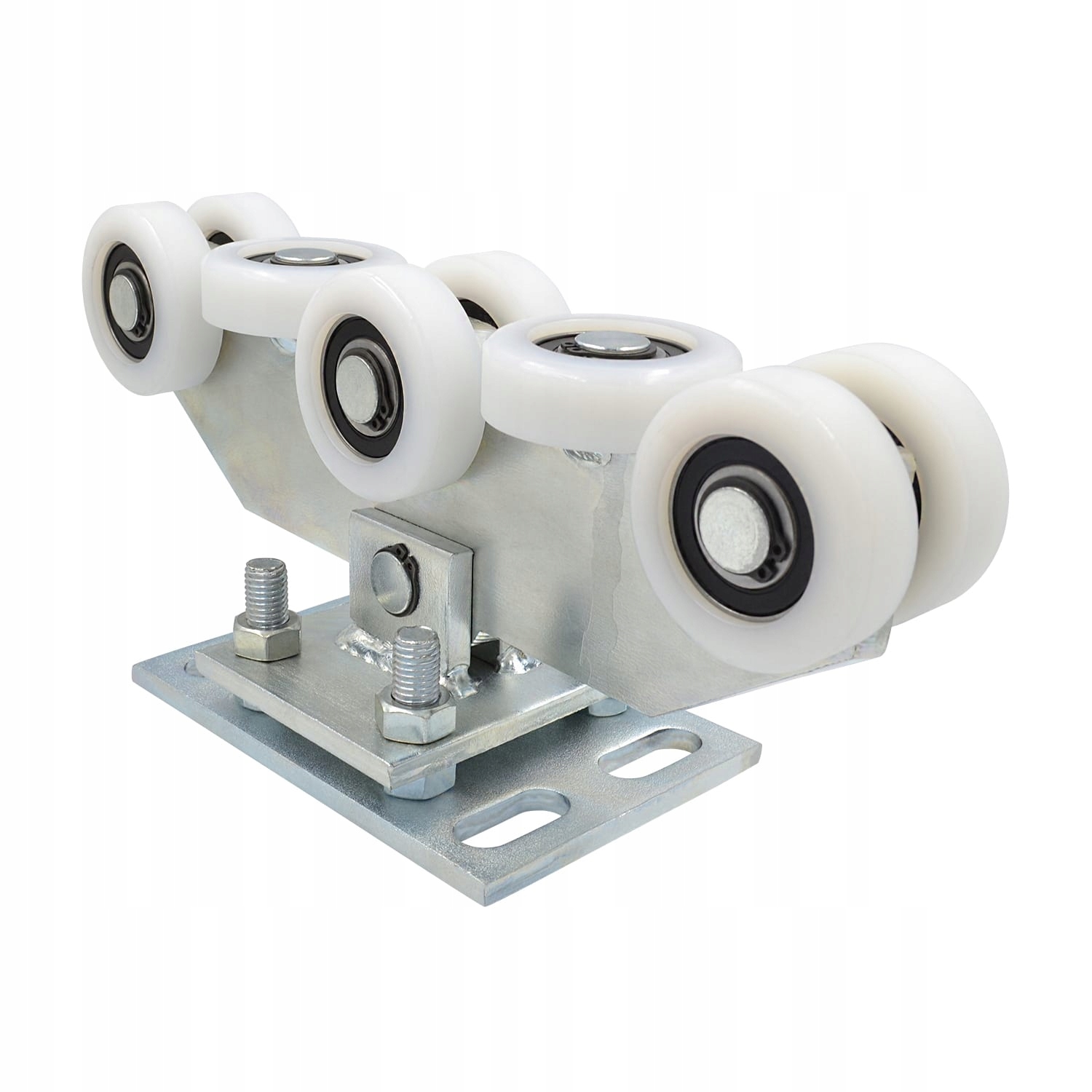 Візок (дві штуки) з 8 роликами з поліаміду (включаючи один горизонтальний ролик). Візок коливається і адаптується до відкатних воріт (з'єднується з основою шпилькою). Він також регулюється по висоті за допомогою гвинтів. Розрахований на рейку 80x80x5 мм. Оцинкований виріб.