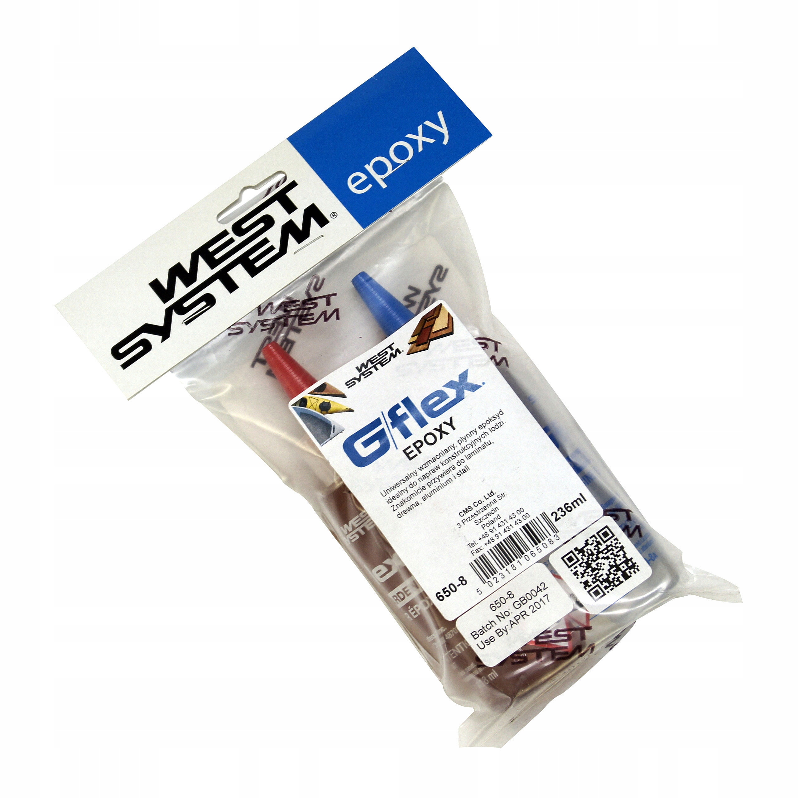 Західна система G/Flex 650-8 Універсальна рідина рідка двокомпонентна епоксидна смола. Він використовується для постійних, водонепроникних засобів для склеювання, виготовлених зі скляних волокон, кераміки, металів, пластмас, вологих і важко поєднувати деревину. Він має 150oooo еластичний модуль PSI, який є більш гнучким, ніж стандартні епоксидні або поліестерні смоли. Продукт має гнучку здатність до структурного зв'язування, що має здатність поглинати скорочення, удари або вібрації. Він ідеально підходить для склеювання різних матеріалів. Суміш можна поєднувати з наповнювачами і може бути використана для заливання арматури склопластику. Змішування дуже просто 1: 1. Робочий час 45 хвилин при 72 градусах C. Геллі протягом 7 - 10 годин, повне затвердіння 24 години.