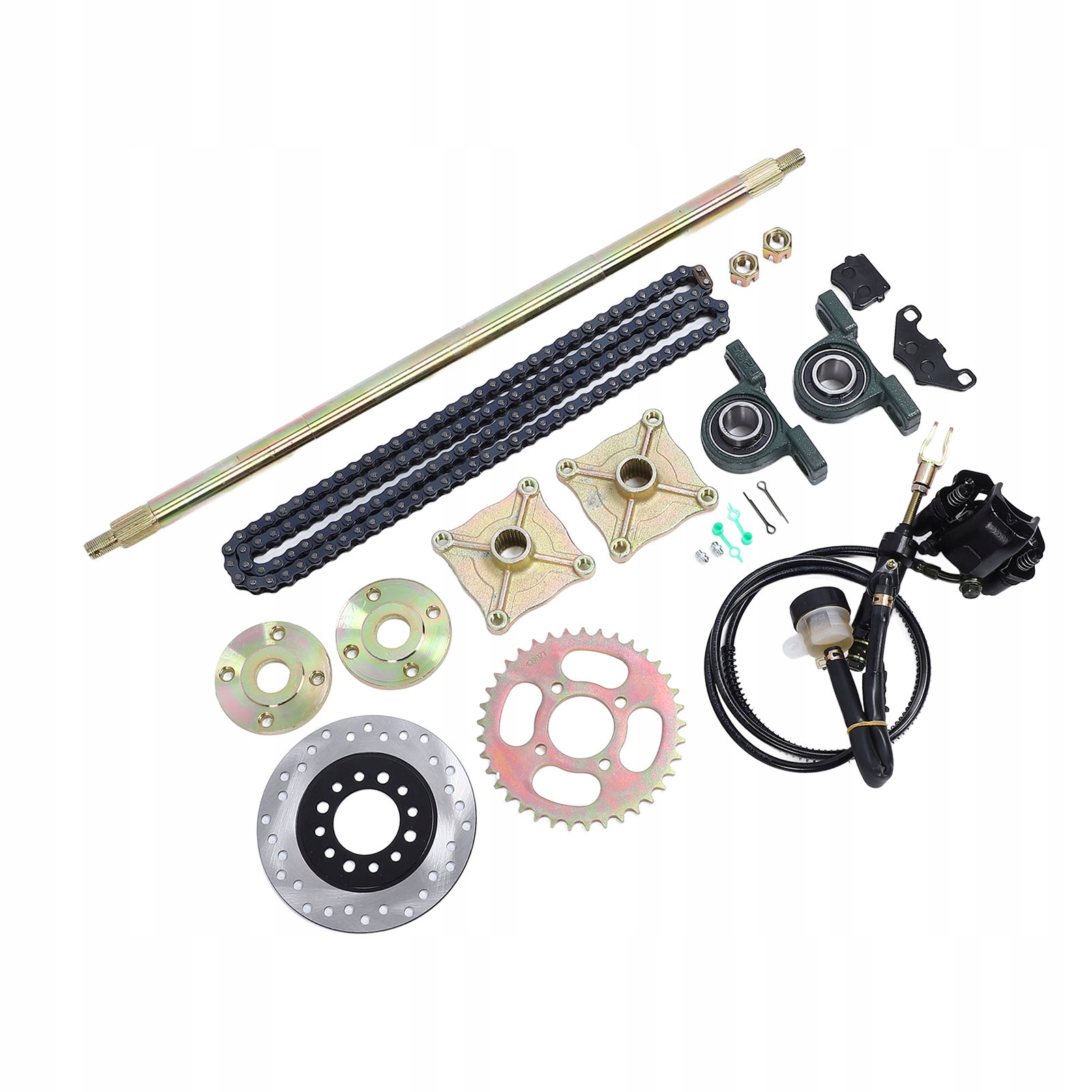 4. Повний набір: набір включає задню вісь 65 см, 205 підшипників, фланець із 23 зубцями та чотирма отворами, зірочку 428 типу 37, гальмівний диск діаметром 16 см, посадочне місце зірочки ланцюга, головний гальмівний циліндр, ланцюг і гвинтовий штифт задньої осі.
