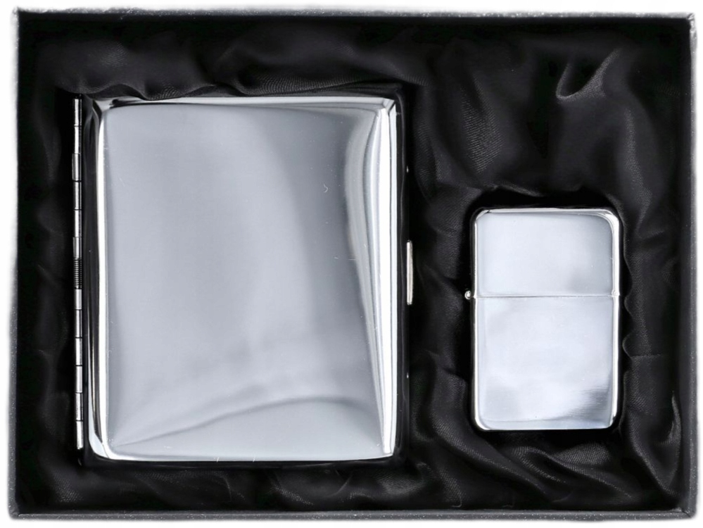 Набір, що складається з бензинової запальнички та портсигара. Упакована в елегантну подарункову коробку з начинкою.