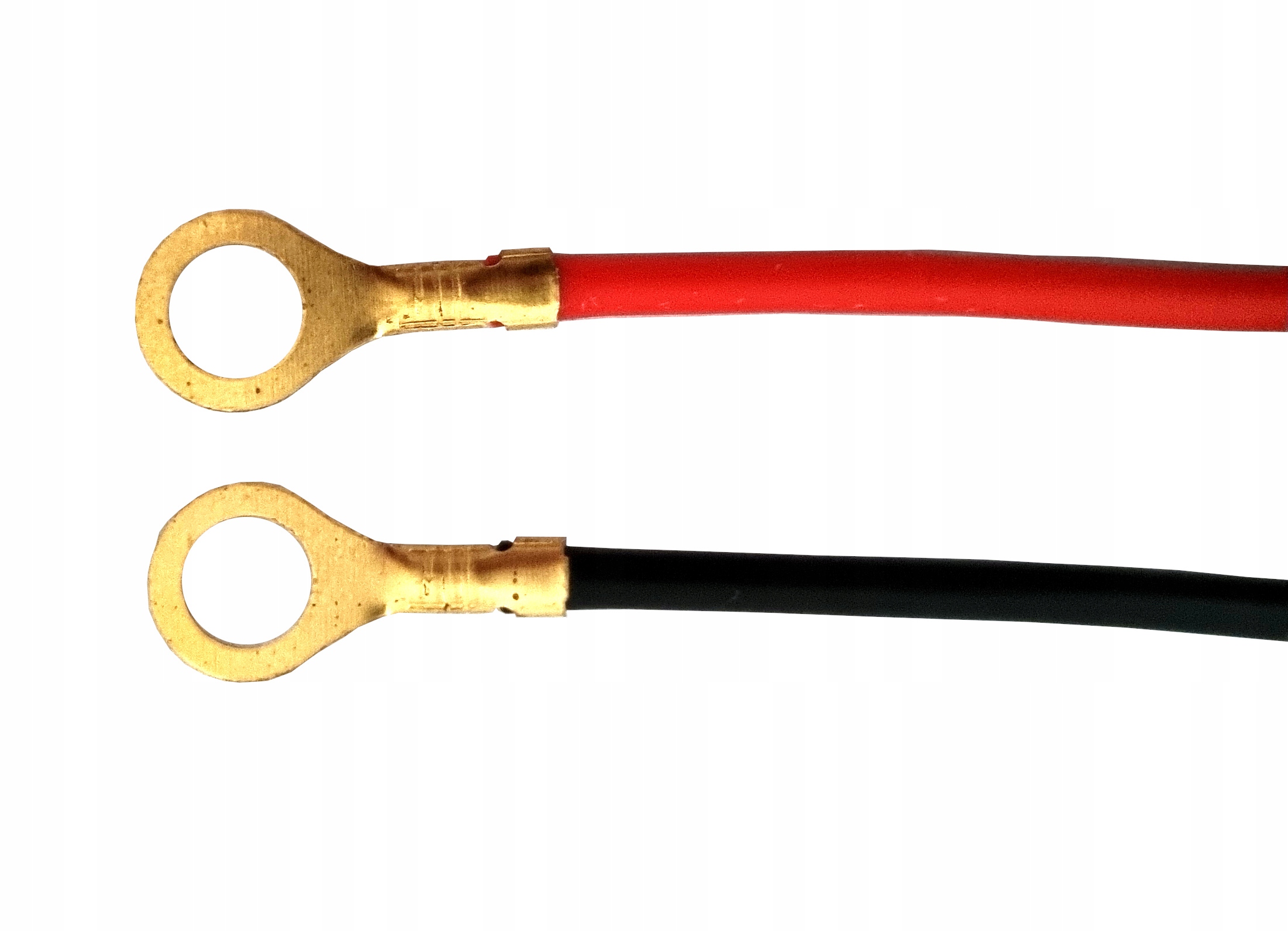 2. червоний "плюсовий" кабель довжиною приблизно 62 см з гніздом для запобіжника, з одного боку завершується отвором для прикручування до акумулятора і, з іншого боку, роз'єм гніздо з ізоляцією.