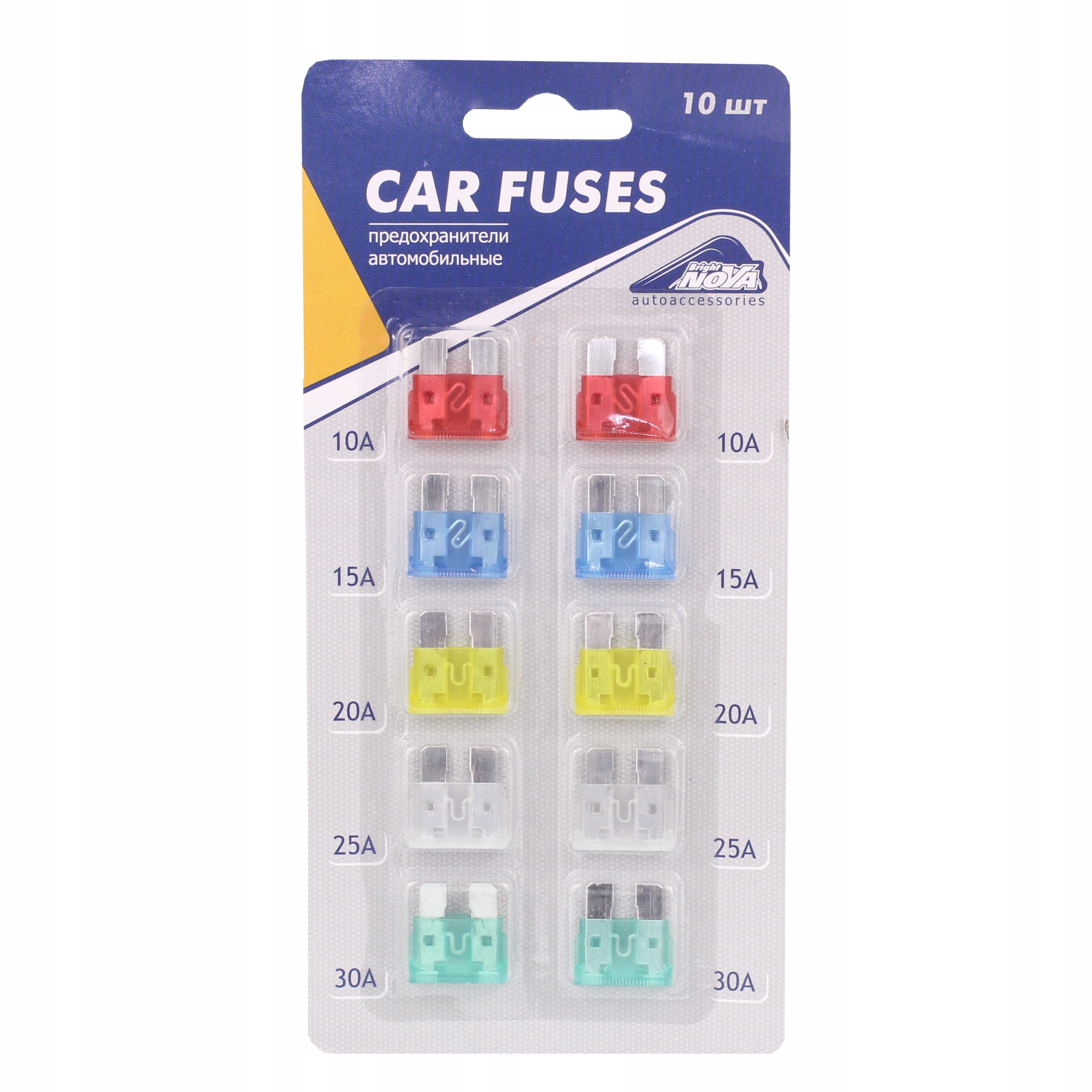 Набір з 10 шт. СТАНДАРТНИХ запобіжників. У комплект входять стандартні запобіжники з різною силою струму. Запобіжники захищають електроніку від короткого замикання. Колір позначений залежно від значення інтенсивності. У набір входять всі найпопулярніші типорозміри запобіжників, які використовуються в тому числі в автомайстернях.