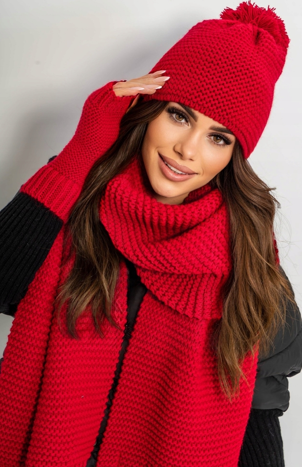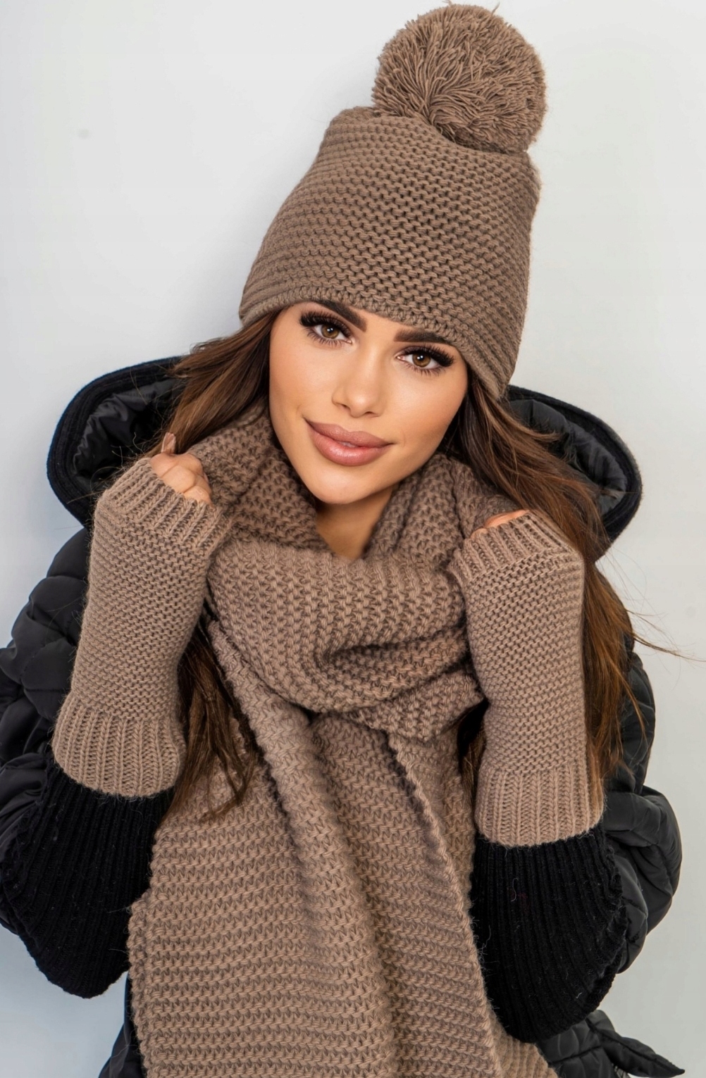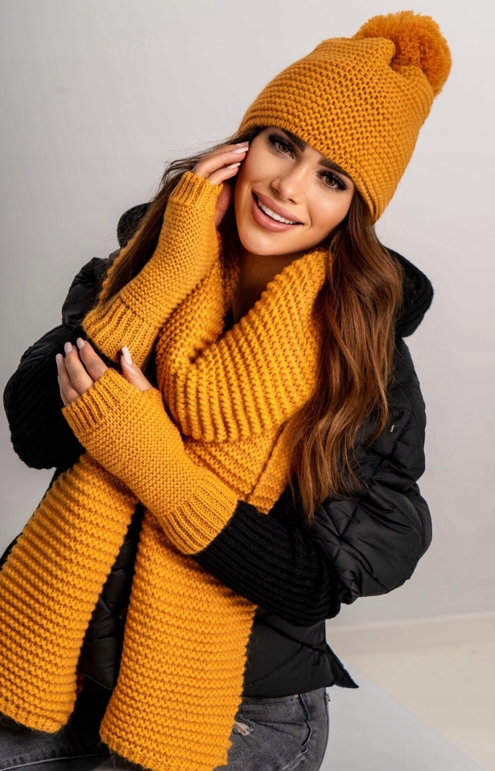 Тепла жіноча шапка, шарф і рукавички в одному кольорі. Ви можете використовувати цей набір для багатьох стилів, надаючи їм характеру та родзинки.