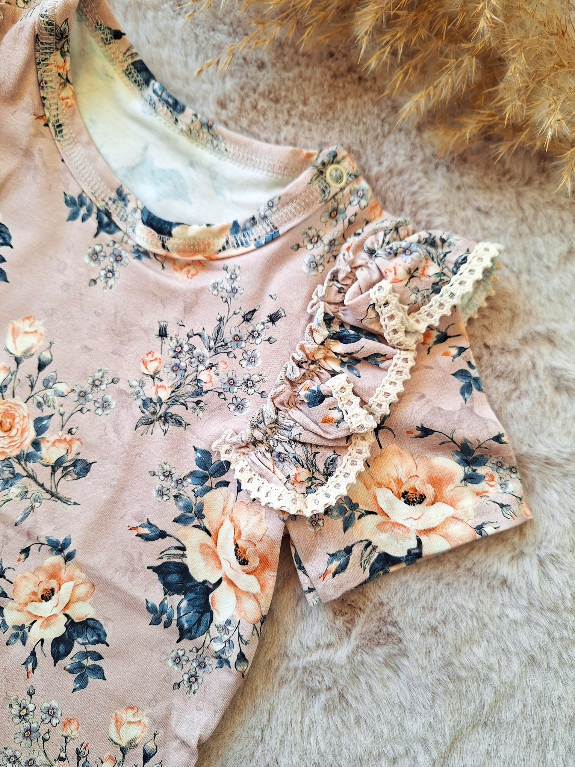 Цей чарівний комплект для дівчинки складається з бежевої спідниці з воланами та блузки з коротким рукавом. Обидві частини комплекту прикрашені красивим квітковим візерунком, що надає їм неповторного шарму.