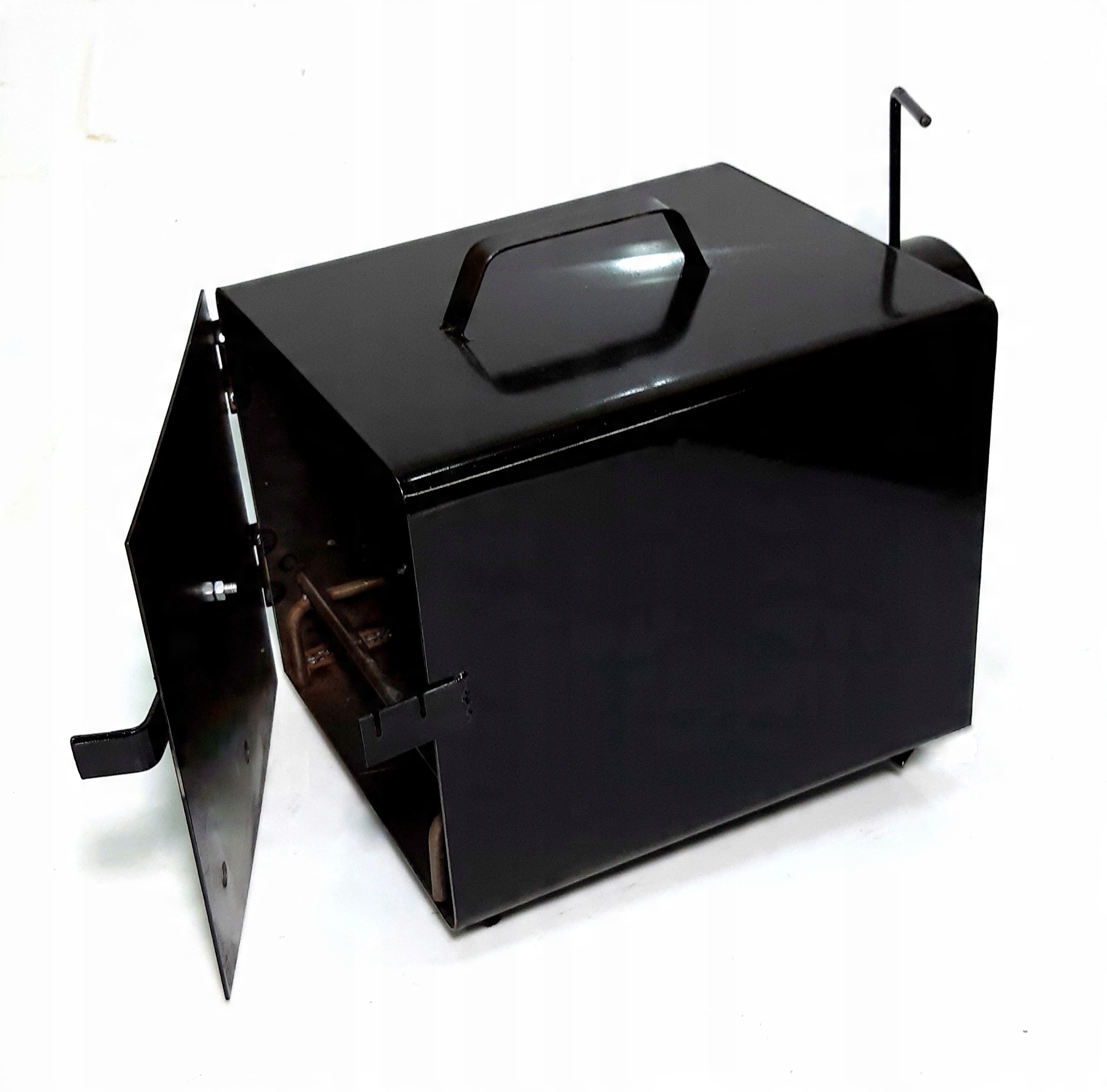 Предмет продажу суцільна металева садова коптильня з товстого чорного листового металу, зовнішня сторона коптильні покрита лаком стійким до температурних і погодних умов. В димохід коптильні встановлена заслінка, завдяки якій ми вирішуємо, скільки диму має залишатися в камері коптильні. Коптильня сконструйована таким чином, що після копчення її можна дуже легко і швидко скласти, тому зберігати її не проблема. Коптильня оснащена термометром, який полегшує процес копчення, контролюючи температуру.