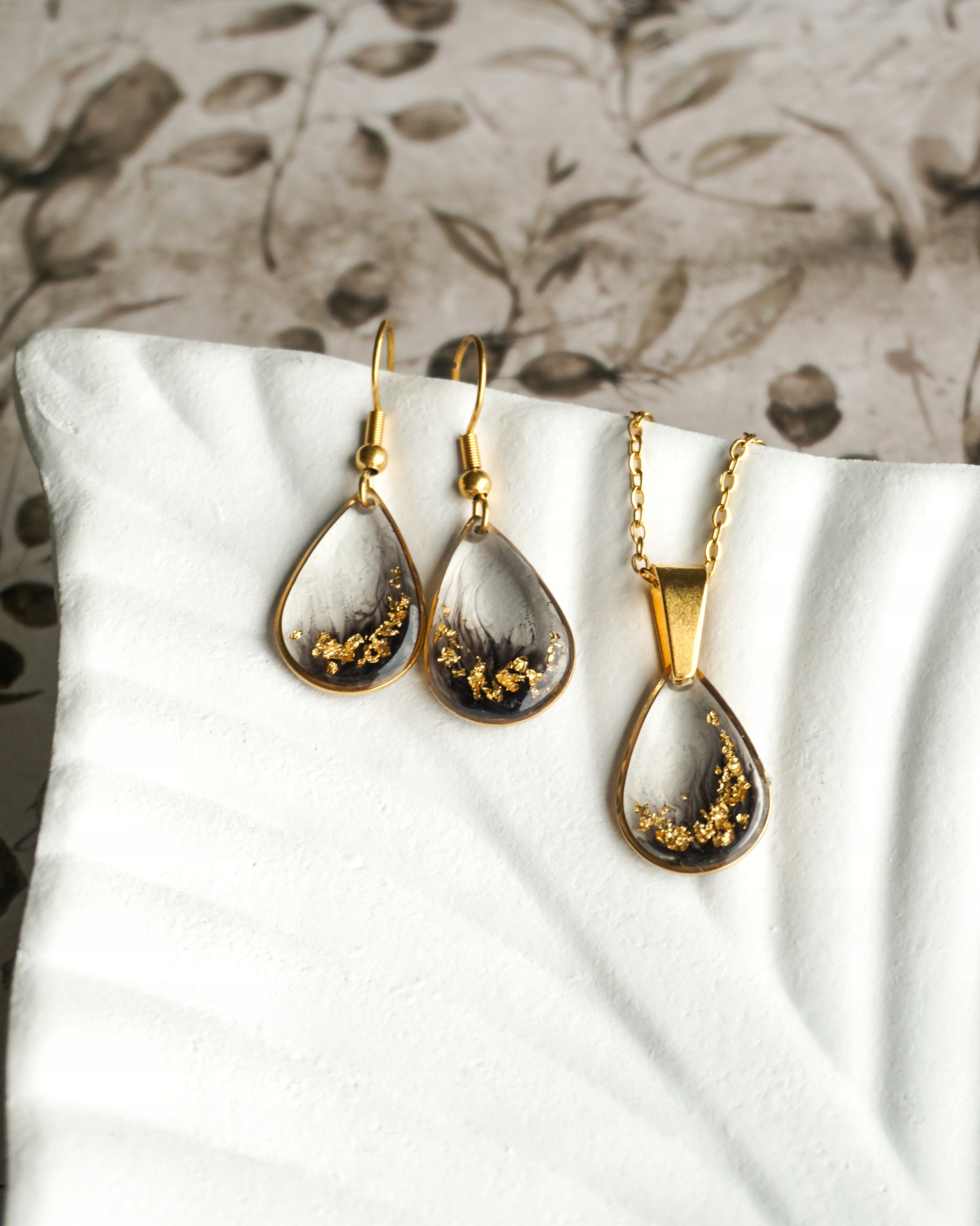 Komplet biżuterii łezki złoto czarny, Prezent na Dzień Mamy