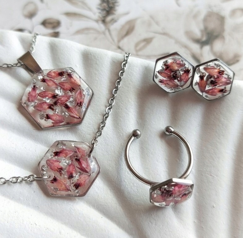 Komplet biżuterii z różowymi kwiatami w żywicy, prezent dla Mamy