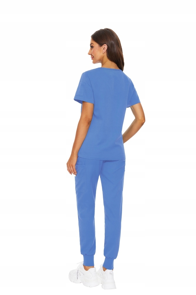 Медичні штани мають середню талію та регулюються за допомогою шнурка на талії. Звужені штанини з ребристими манжетами створюють стильний вигляд без шкоди для свободи рухів і комфорту під час роботи. Кишені на обох штанинах, що забезпечують легкий і швидкий доступ до підручних предметів, є практичним елементом штанів, який оцінить кожен користувач брюк. Використаний гнучкий і міцний матеріал забезпечує комфортне носіння без зниження довговічності всього медичного набору.