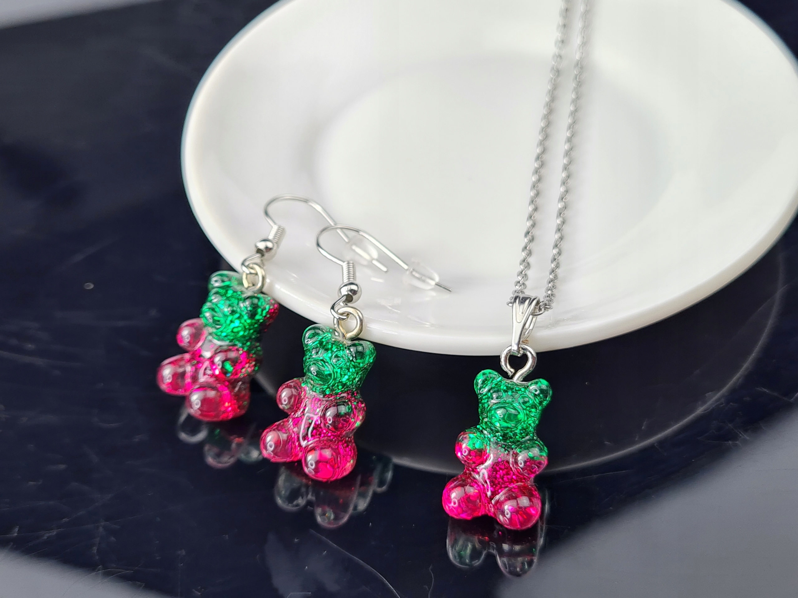 Komplet NASZYJNIK KOLCZYKI MIŚ HARIBO ŻELKI Zielono-Czerwony Brokat K16