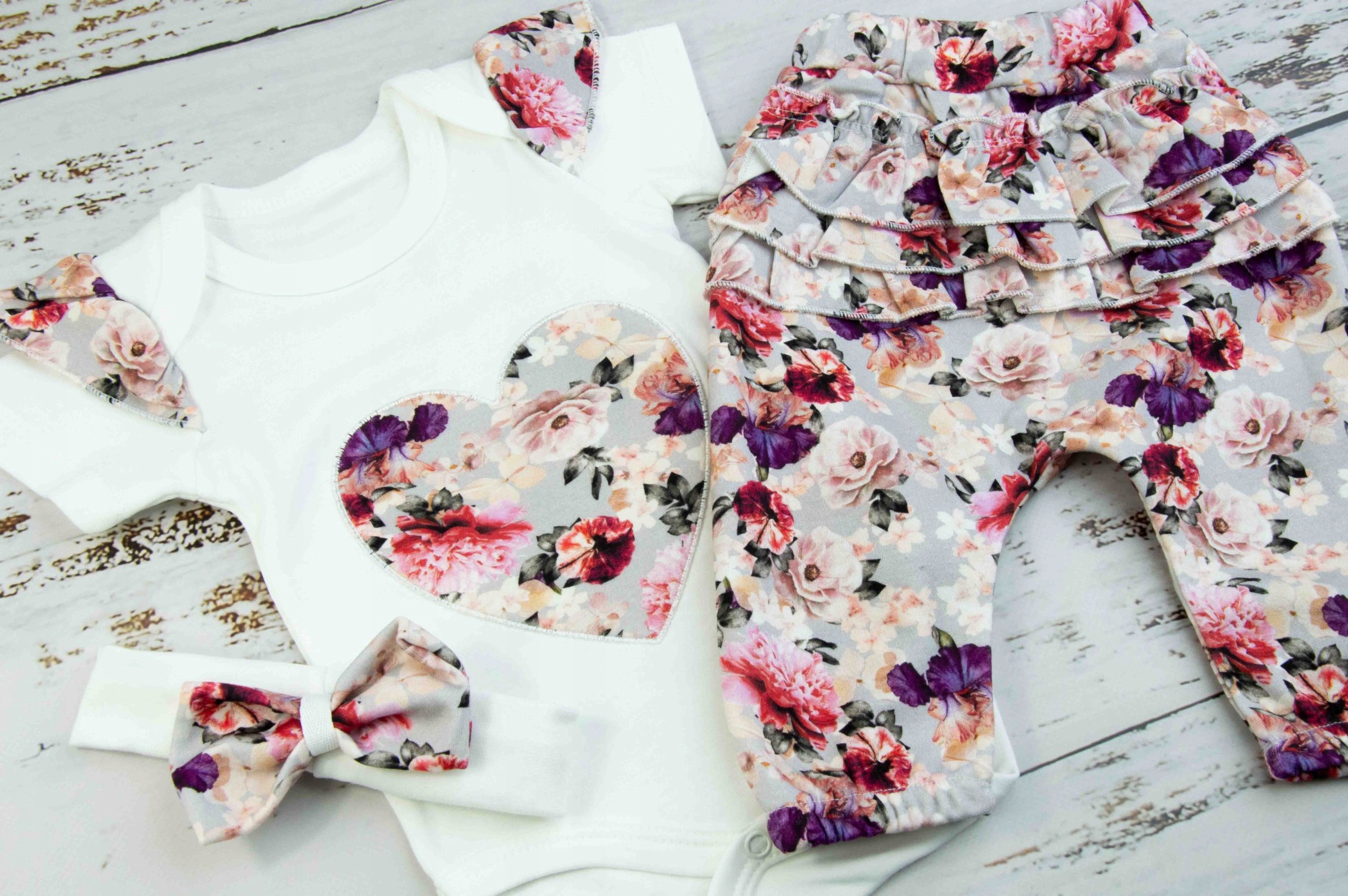 Боді маєромантичні квітчасті волани на плечах. На грудях пришито сердечко з квітковим мотивом, ідентичним тому, що на шортах. Зручні складки на плечах і застібки на промежині гарантують, що одяг не тільки чудово виглядає, але й зручний у використанні!