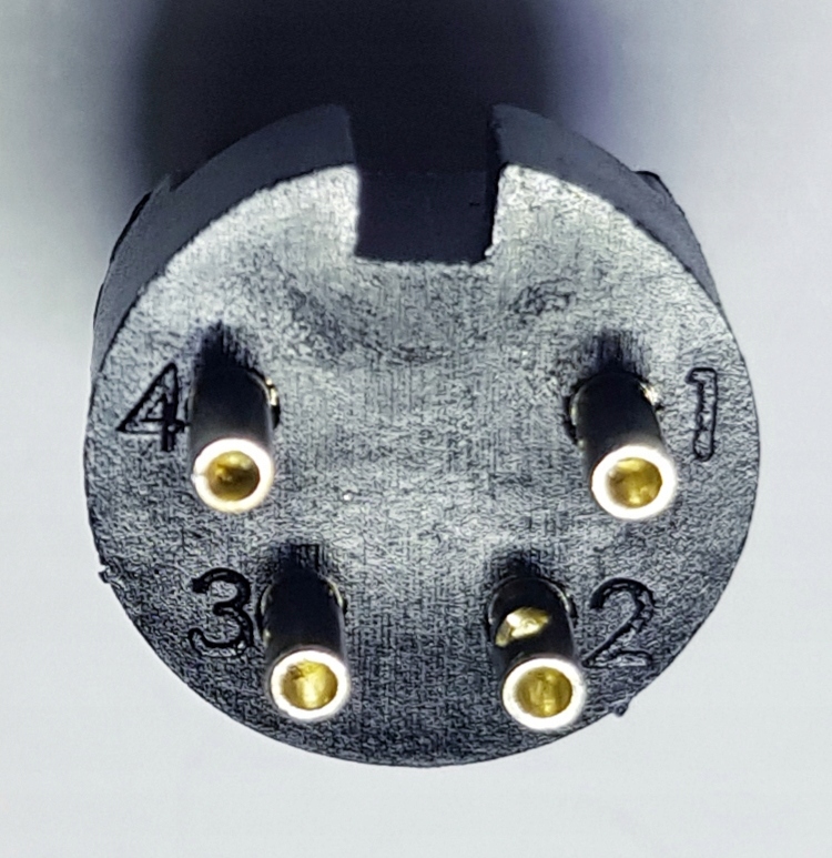 4-контактний мікрофонний штекер DIN, deltron 591-0400 , часто використовується у звукових системах спеціалізованих тренерів та туристичних автобусів.