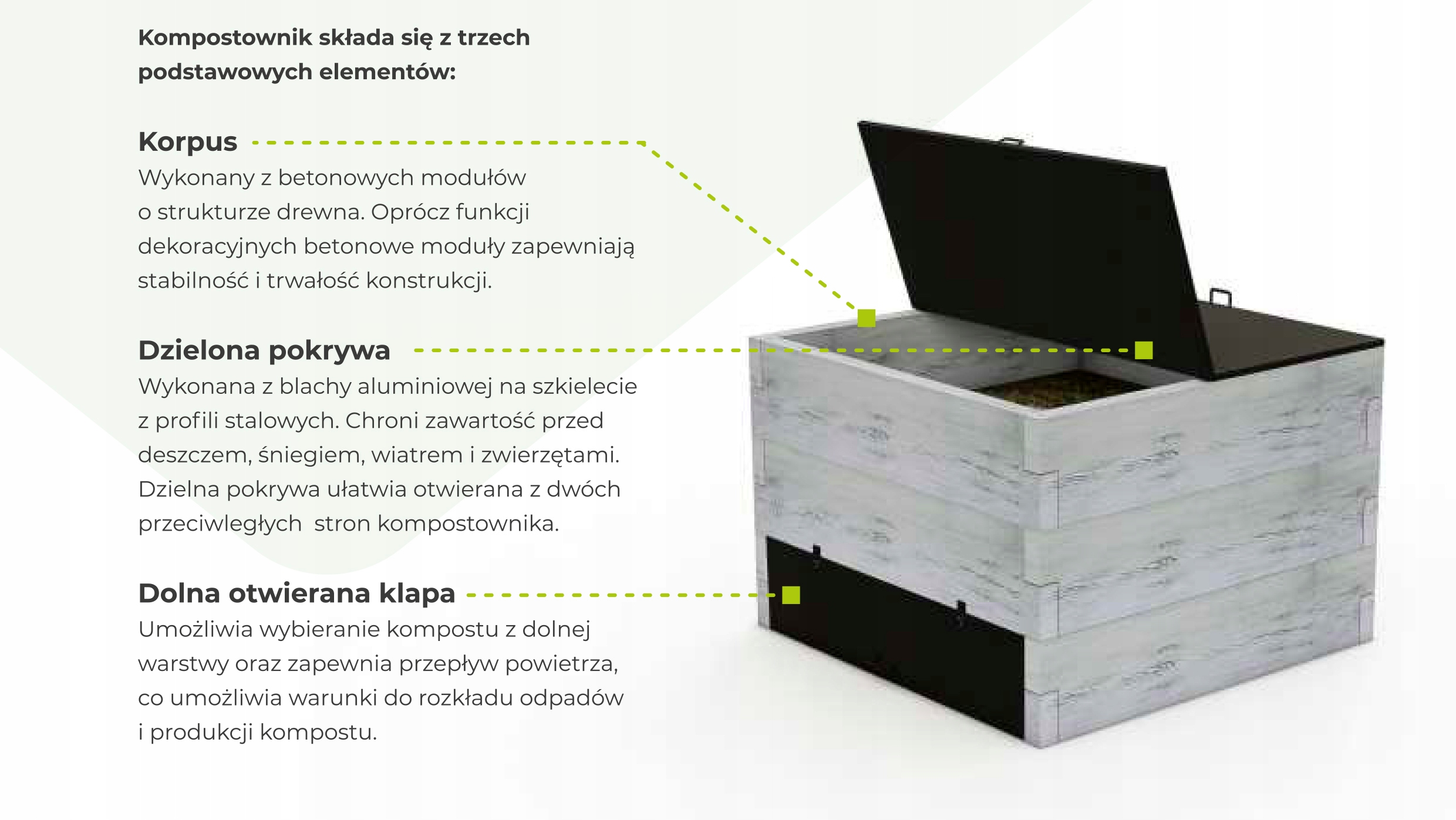Через те, що коробка передач виготовлена з бетону, компостер дуже довговічна і буде служити багато років , на відміну від дерев’яних ящиків, які з часом зламаються. Скри, які ми пропонуємо, виготовлені з бетону, що імітує деревину, камінь або травертину (архітектурний бетон), що робить їх надзвичайно естетичними.