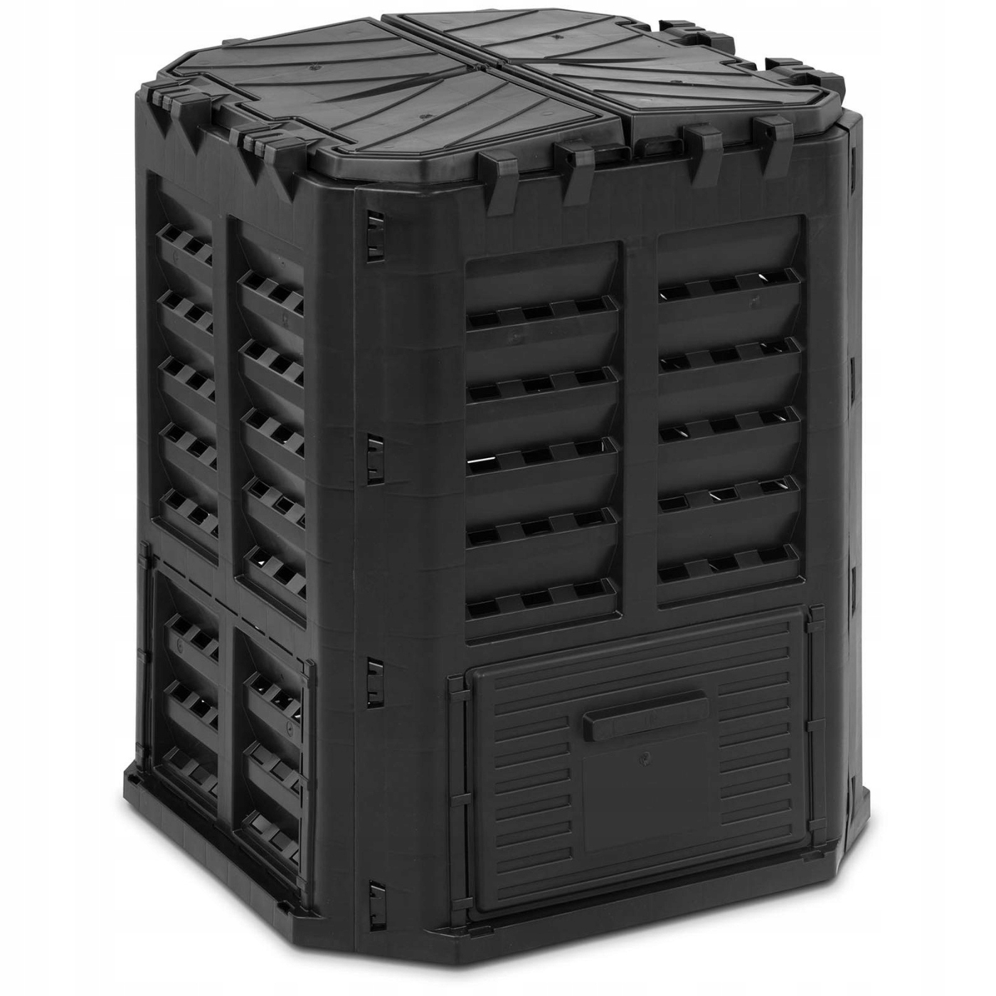 Дизайн стін запобігає проникненню всередину великих тварин. Вентиляційні отвори та система крапельного зрошення створюють ідеальні умови, в яких скошена трава, листя та яєчна шкаралупа повільно розкладаються, перетворюючись на багатий поживними речовинами гумус. Компостер на землі оснащений заслінкою, через яку можна видалити отриману садову землю. Завдяки компостеру ви можете ефективно перетворювати відходи на живильне джерело енергії для рослин у вашому саду.